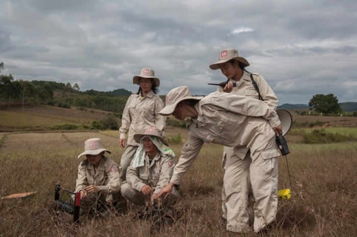 | Một đội dò mìn đang kiểm tra một cánh đồng thuộc khu vực Man Som, tỉnh Xieng Khouang. |