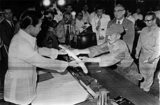 | Bức ảnh chụp năm 1974, Onoda trao kiếm cho Tổng thống Philippines khi đó là Ferdinand Marcos để đầu hàng (Nguồn: AFP) |