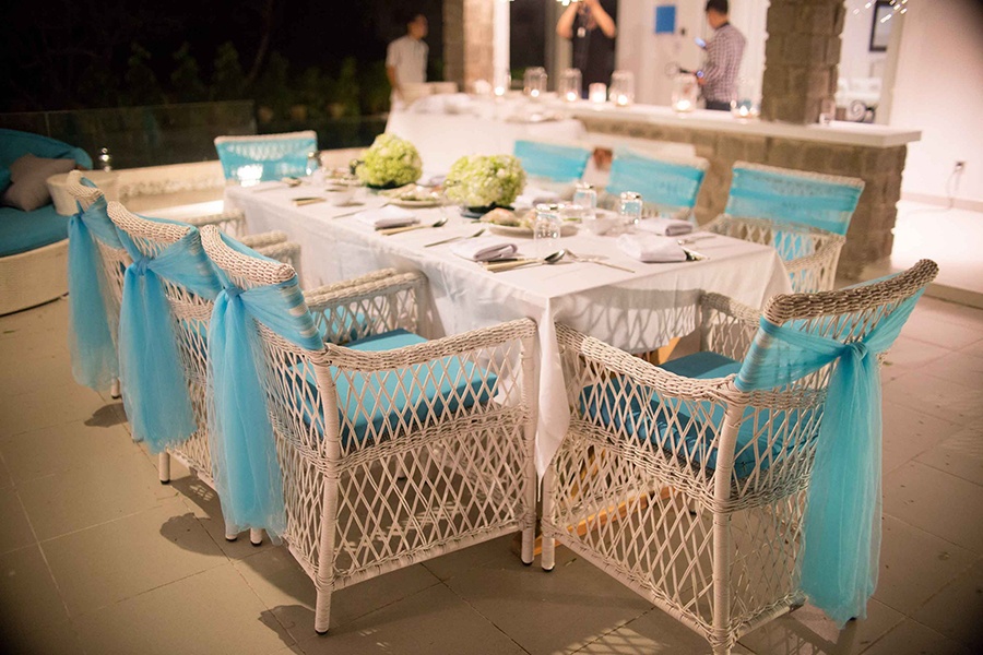 | Bàn tiệc đơn giản do Tú Vi tự tay trang trí. Gam màu xanh nước biển và trắng tượng trưng cho sự yên bình, hạnh phúc trong cuộc sống hôn nhân mà Tú Vi hằng mơ ước. |