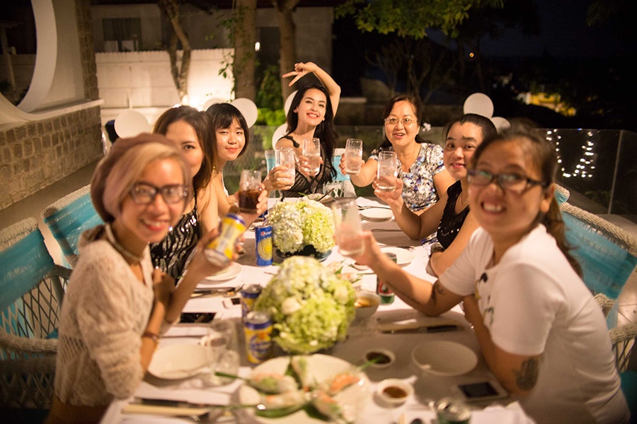 | Buổi tiệc diễn ra trong không khí thân thiết, gần gũi. Bạn bè nâng ly chúc mừng Tú Vi có một đám cưới như ý, sống hạnh phúc trọn đời bên ông xã điển trai. |