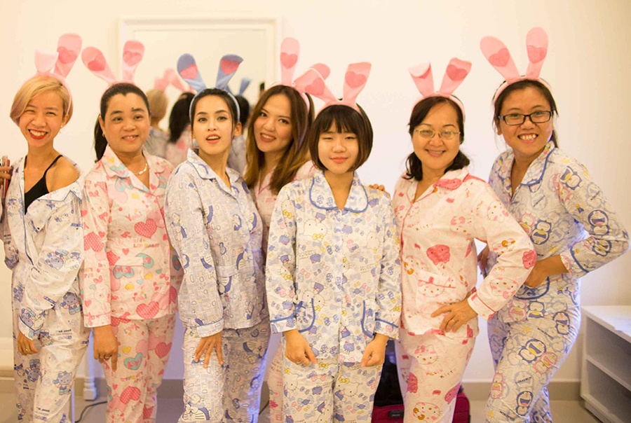 | Khách mời được yêu cầu diện đồ ngủ, chụp ảnh tinh nghịch, đáng yêu cùng chủ nhân buổi tiệc. |