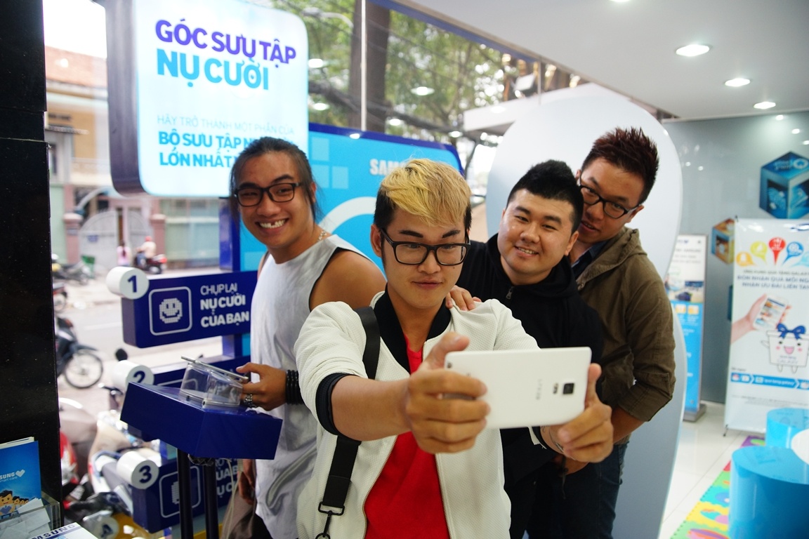 | Các chàng trai của nhóm FBand cũng mải mê chụp selfie ở “Góc sưu tập nụ cười” với hy vọng được nhận quà là điện thoại Galaxy A5, A7 và S6 Edge. |
