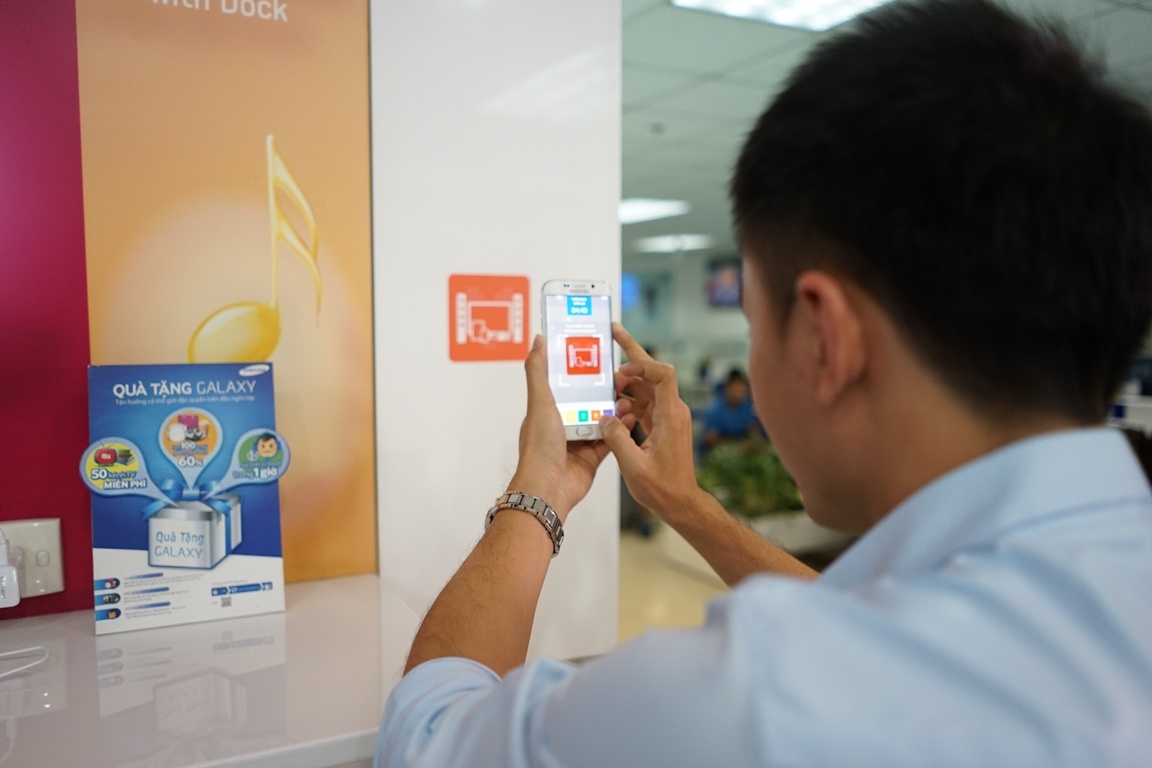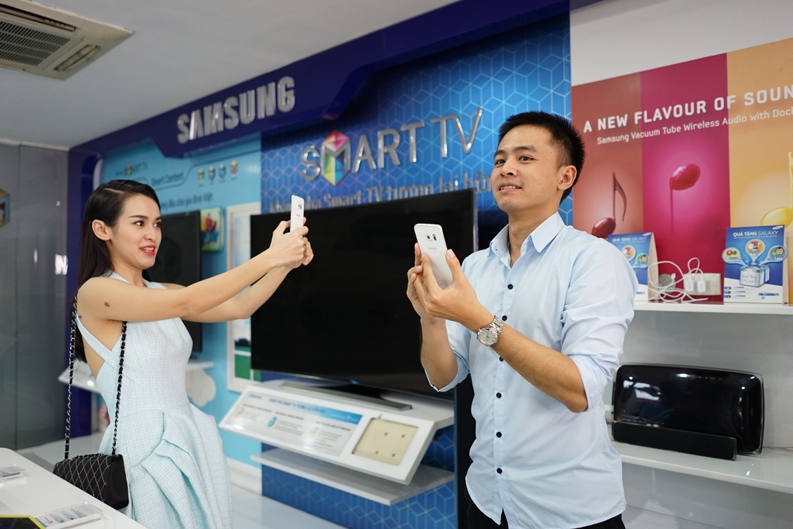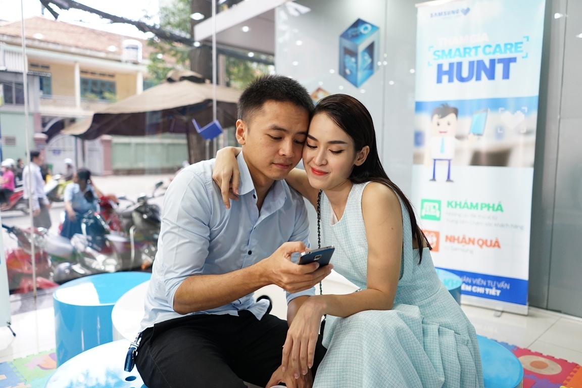 | Cùng nhiều bạn trẻ khác, cặp diễn viên thoải mái trải nghiệm những sản phẩm mới tại Trung tâm chăm sóc khách hàng của Samsung. |