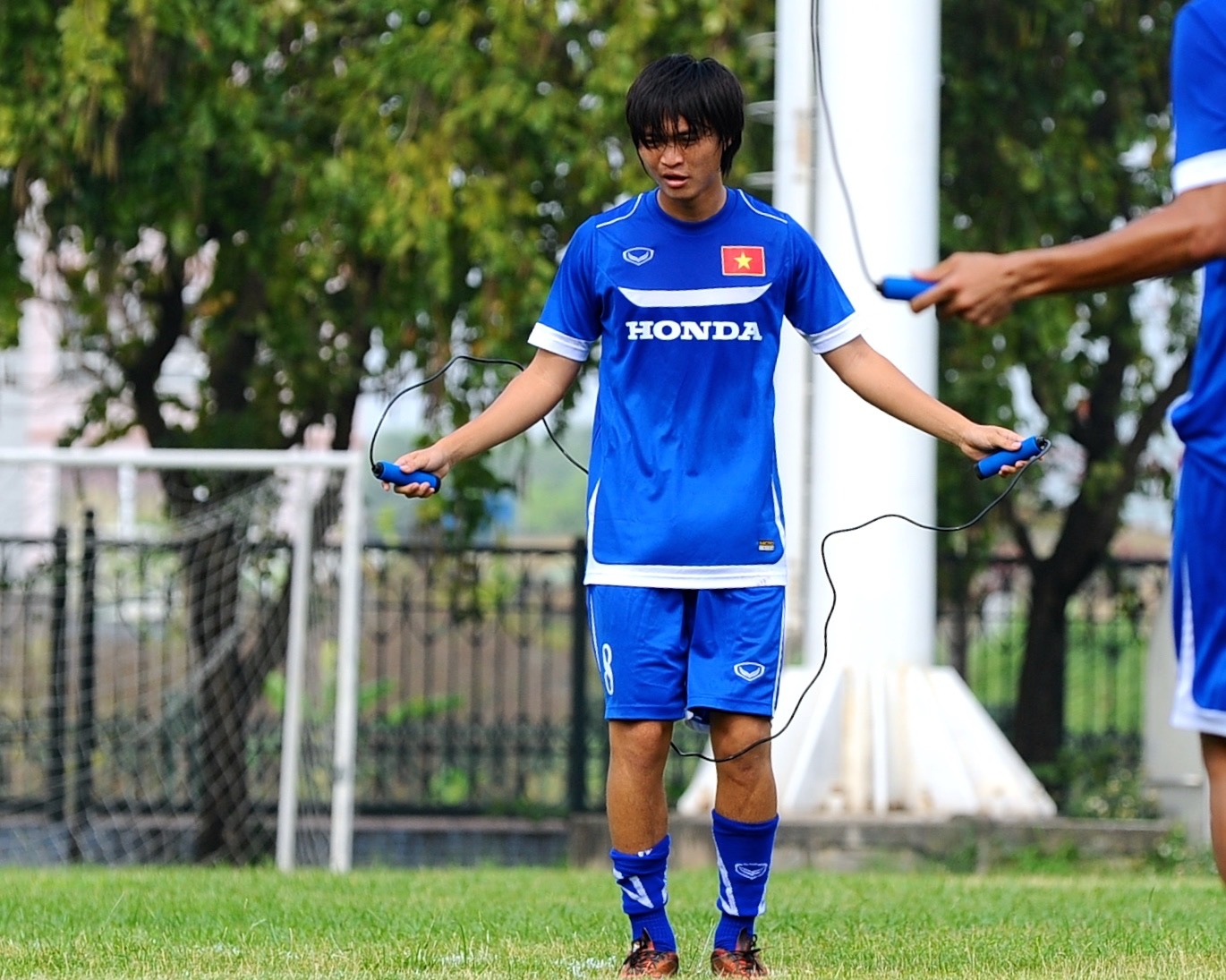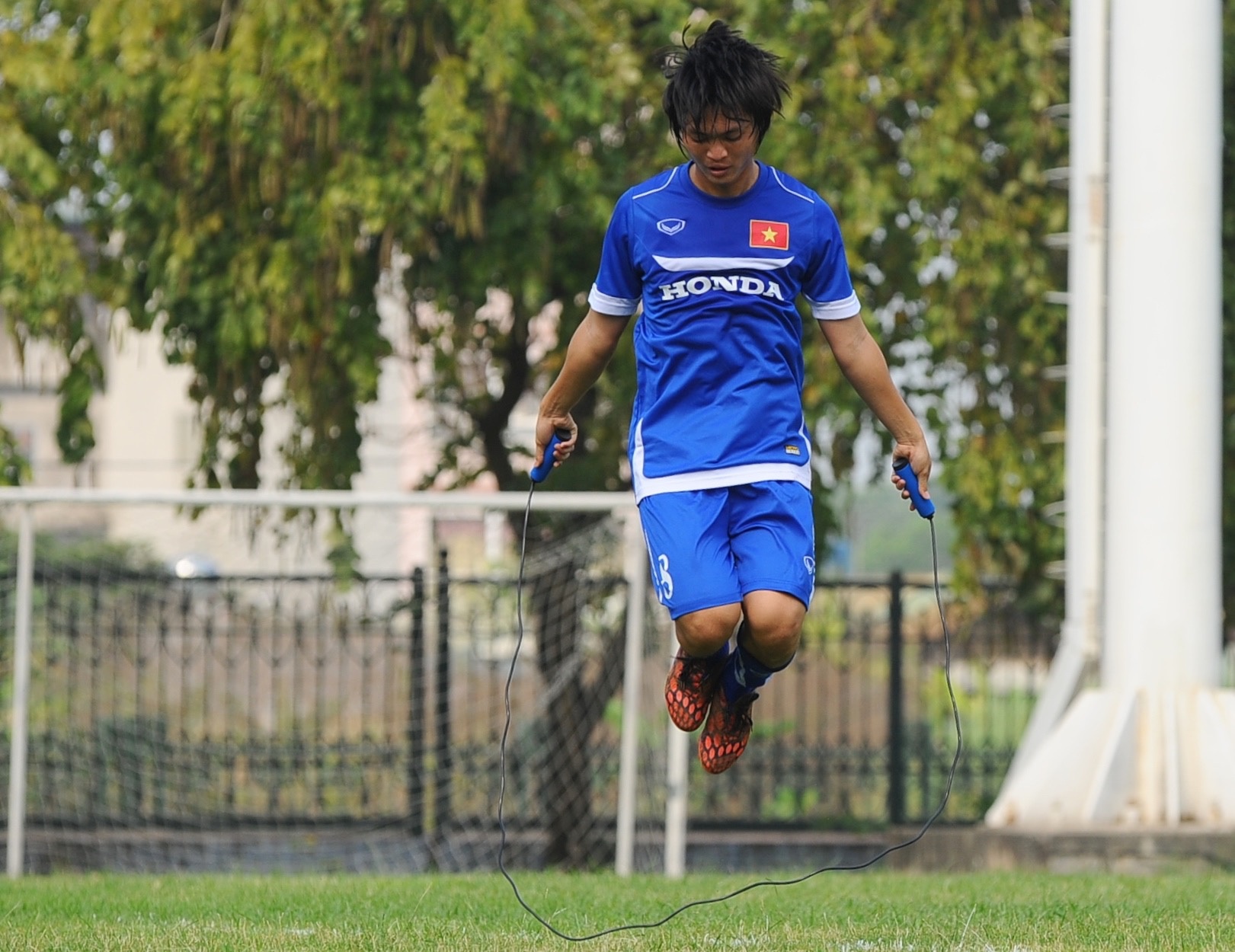 | Tuy nhiên tiền vệ Tuấn Anh tỏ ra bỡ ngỡ và nhiều lần bị vấp khi đây là lần đầu tiên anh tập nhảy dây. |