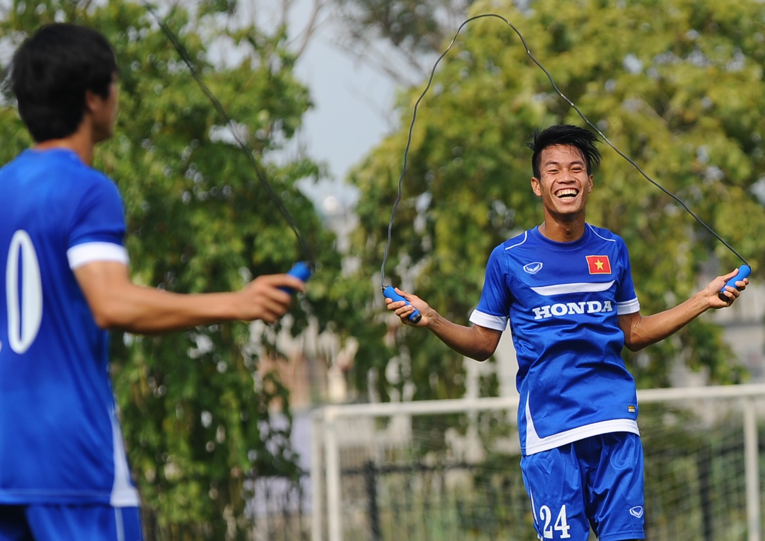 | Hậu vệ Văn Sơn, đồng đội của Tuấn Anh ở CLB HAGL cười sảng khoái với bài tập của HLV Miura. Trong buổi sáng nay, 4 cầu thủ gặp chấn thương gồm Thanh Tùng, Ngọc Thắng, Hồng Duy và Xuân Trường được cho nghỉ và bác sĩ Shinichi tiếp tục đưa các cầu thủ này đến bệnh viện để kiểm tra. |