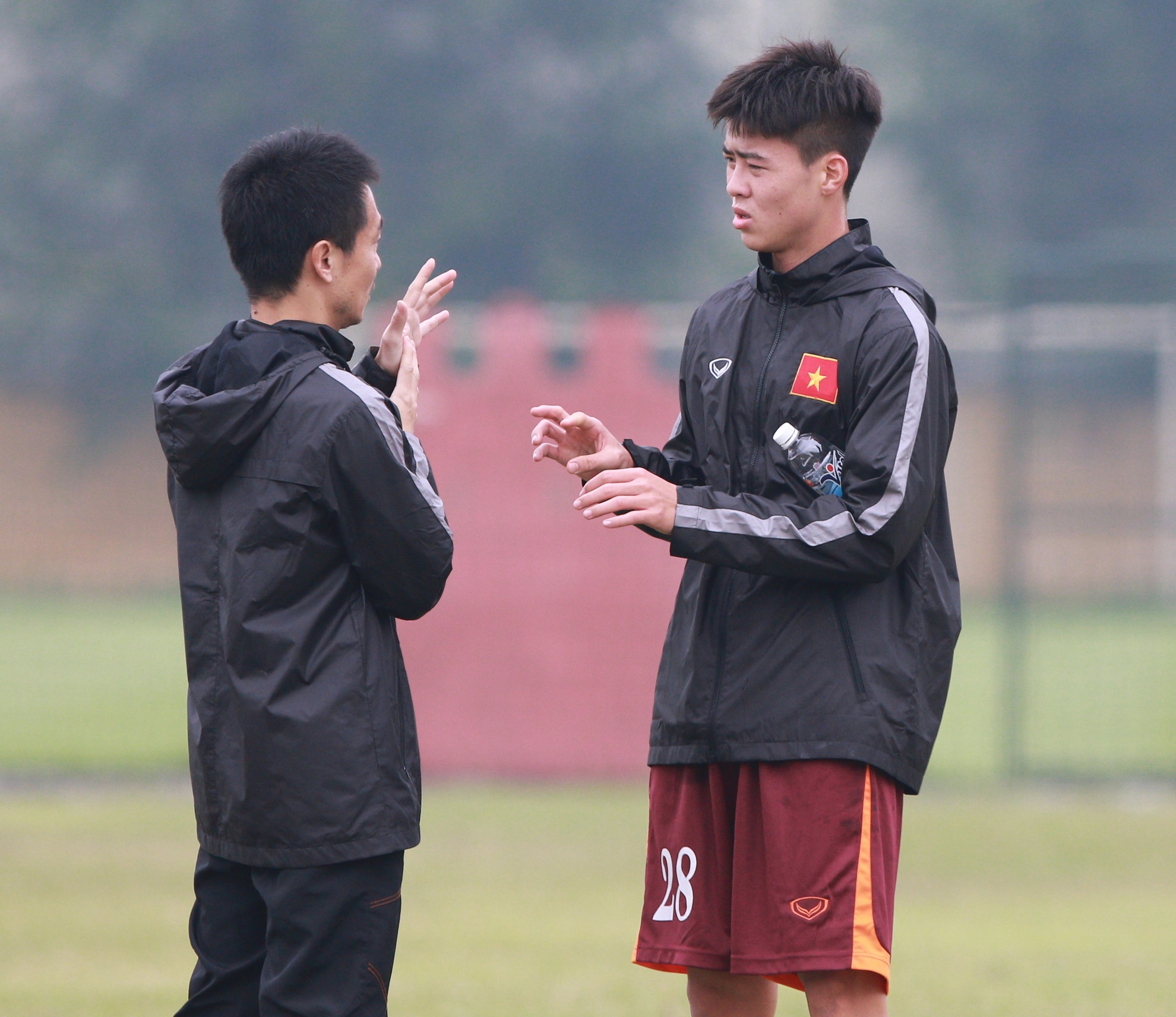 | Hiện tại, tiền vệ Duy Mạnh và Tuấn Anh là 2 trường hợp gặp chấn thương phức tạp nhất ở U23 Việt Nam. Sau 14 ngày hội quân, Duy Mạnh (28) chưa thể tập cùng các đồng đội do chấn thương dây chằng chéo trước tại giải U21 quốc tế. Tiền vệ của HAGL cũng gặp chấn thương tương tự ở đầu gối phải trong buổi tập chiến thuật đầu tiên cùng U23 Việt Nam hôm 10/12. Bác sĩ trị liệu Nhật Bản, ông Shinichi (trái) được Ban huấn luyện giao trọng trách điều trị chấn thương cho 2 trụ cột tuyến giữa của U23 Việt Nam. |