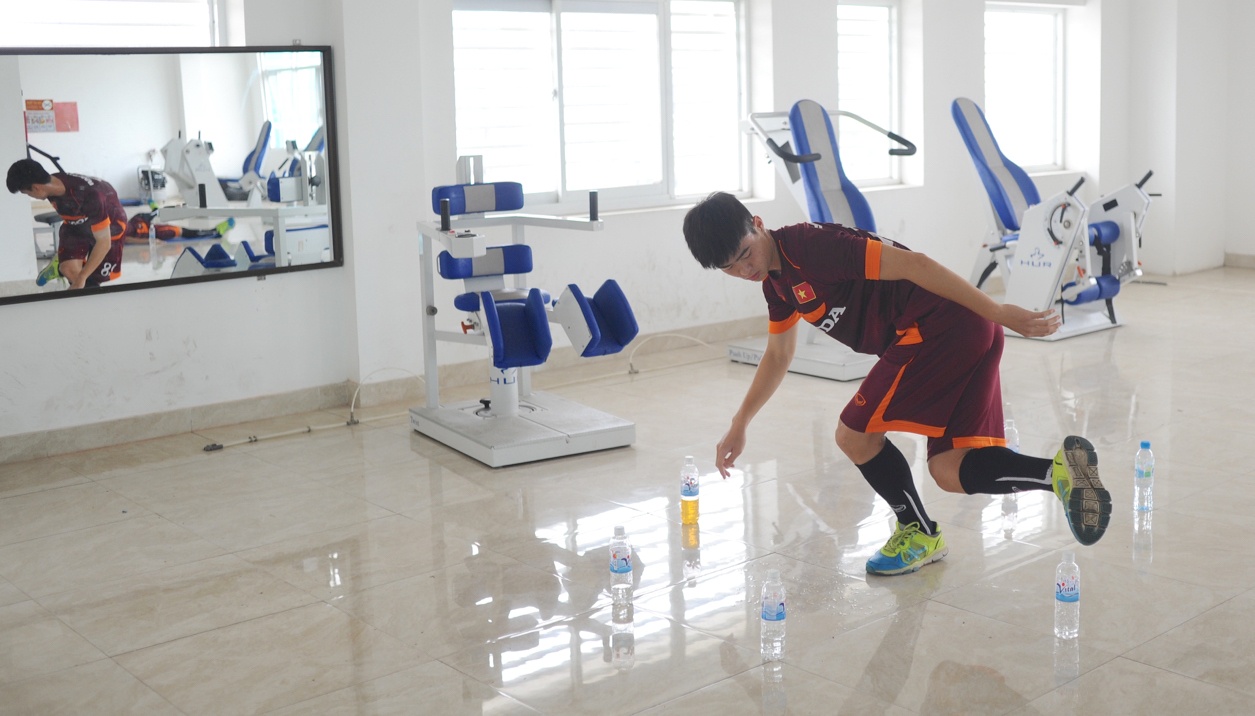 | Hàng ngày, Tuấn Anh và Duy Mạnh phải tập riêng trên phòng gym của Trung tâm đào tạo trẻ VFF. Tuy nhiên, cặp tiền vệ U23 Việt Nam không sử dụng những máy móc, thiết bị hiện đại có sẵn. Bác sĩ Shinichi yêu cầu họ thu các vỏ chai nước uống dở làm công cụ hỗ trợ tập luyện. Trong ảnh, Duy Mạnh tập động tác giữ thăng bằng 1 chân, chân còn lại lần lượt chạm các nắp chai nước được xếp thành vòng tròn. |