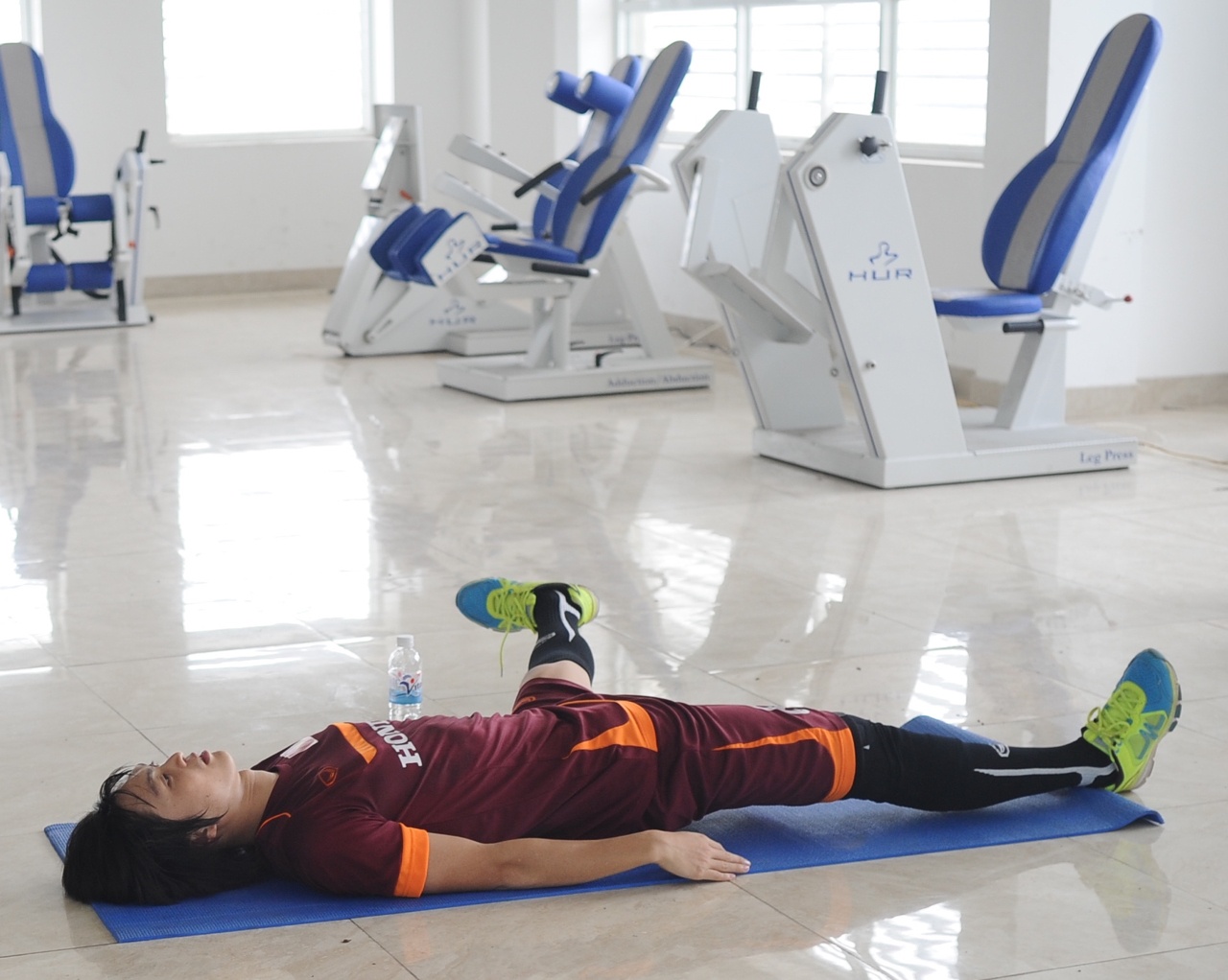 | Duy Mạnh đã điều trị chấn thương được gần nửa tháng nên tập nặng hơn. Tuấn Anh mới gặp chấn thương hôm 10/12 nên chỉ tập nhẹ. Tiền vệ tương lai của Yokohama FC nằm dưới tấm thảm cao su, căng ngang chân chạm vị trí chai nước được bác sĩ Shinichi đặt sẵn. |