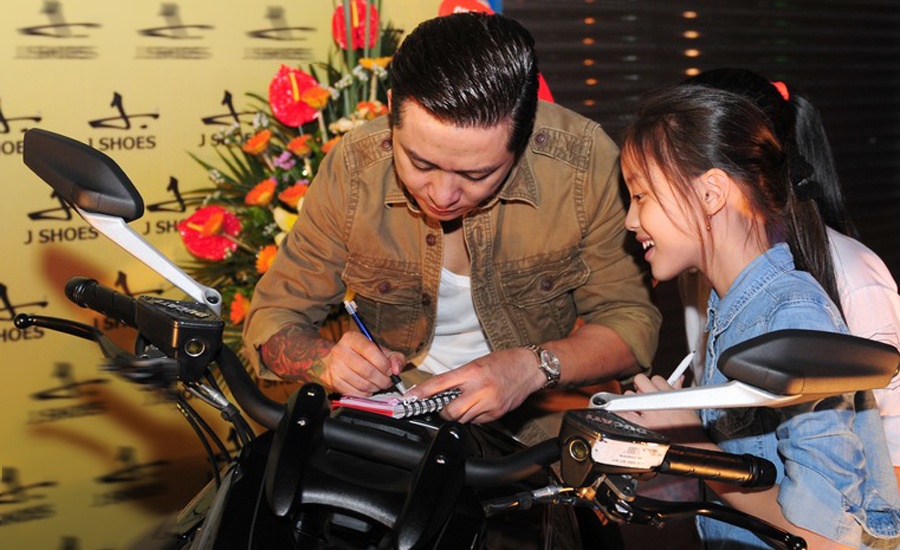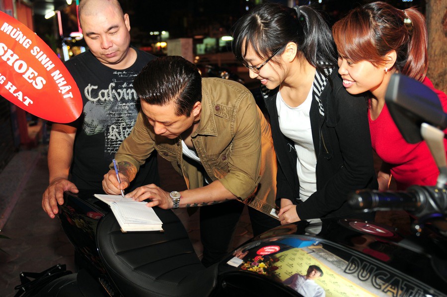 | Trong sự kiện khai trương tiệm giày mới của mình, Tuấn Hưng nhanh chóng khoe chiếc motor khủng mới sắm. Chiếc Ducati màu đen này được nam ca sĩ mua chiều cùng ngày với giá lên tới gần 700 trăm triệu đồng. Anh là một trong những nghệ sĩ hiếm hoi của V-biz có sở thích cầm lái những chiếc motor độc trên đường đông. |