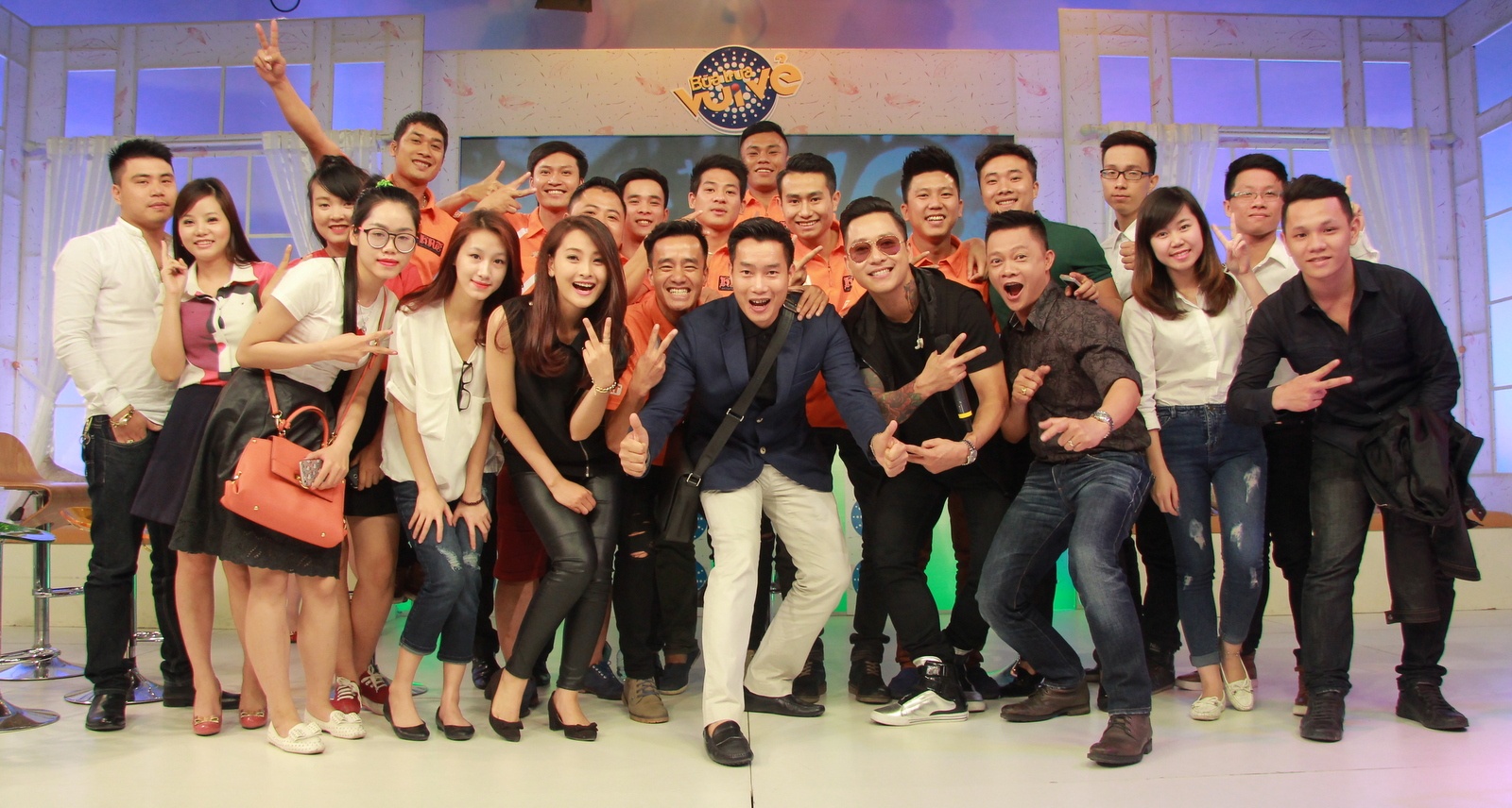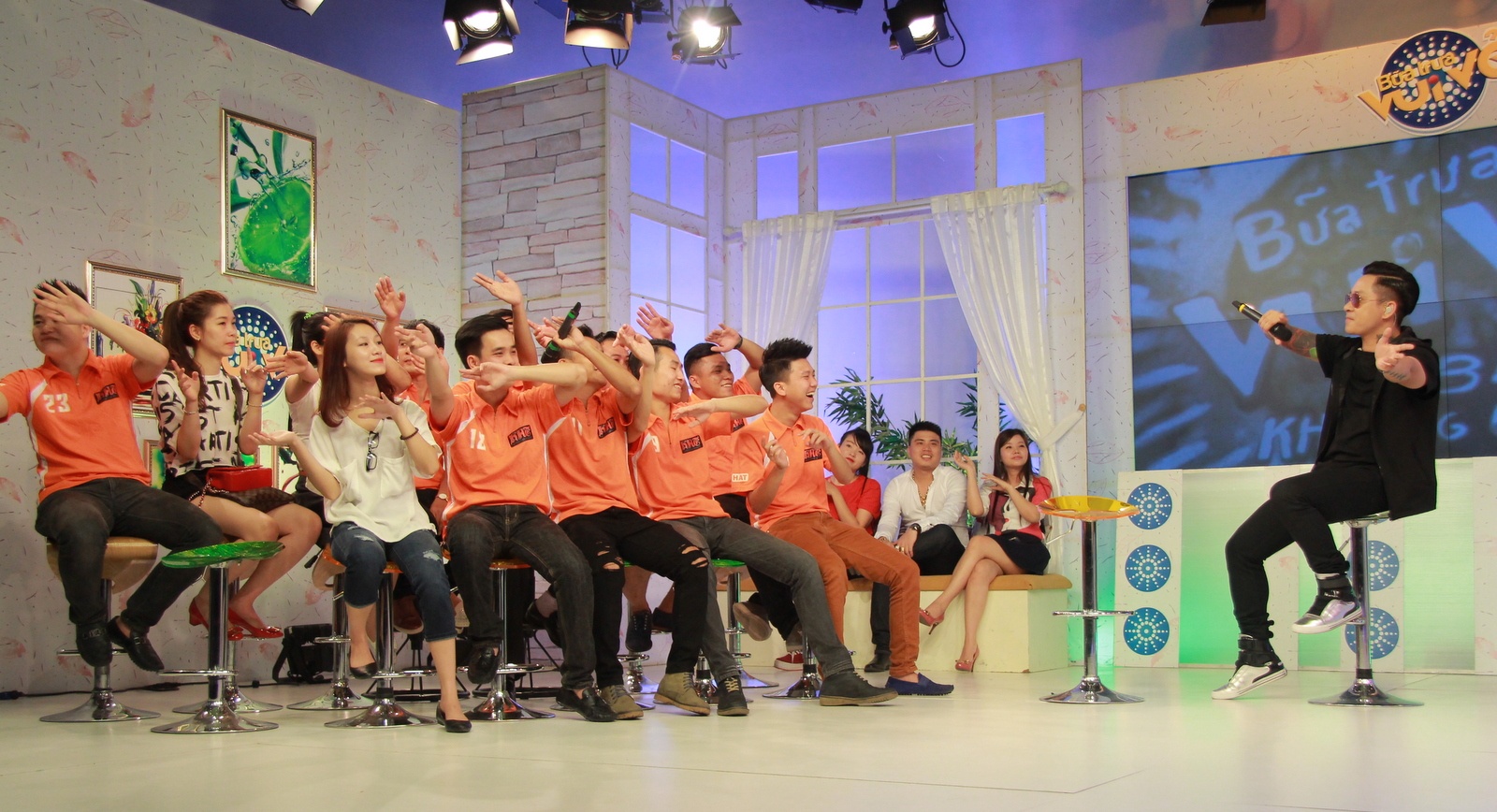 | Trưa 23/4, Tuấn Hưng có mặt tại trường quay S10 để thực hiện chương trình Bữa trưa vui vẻ. Các thành viên và cổ động viên trong đội bóng H.A.T cũng tới cổ vũ cho ông bầu Tuấn Hưng. |