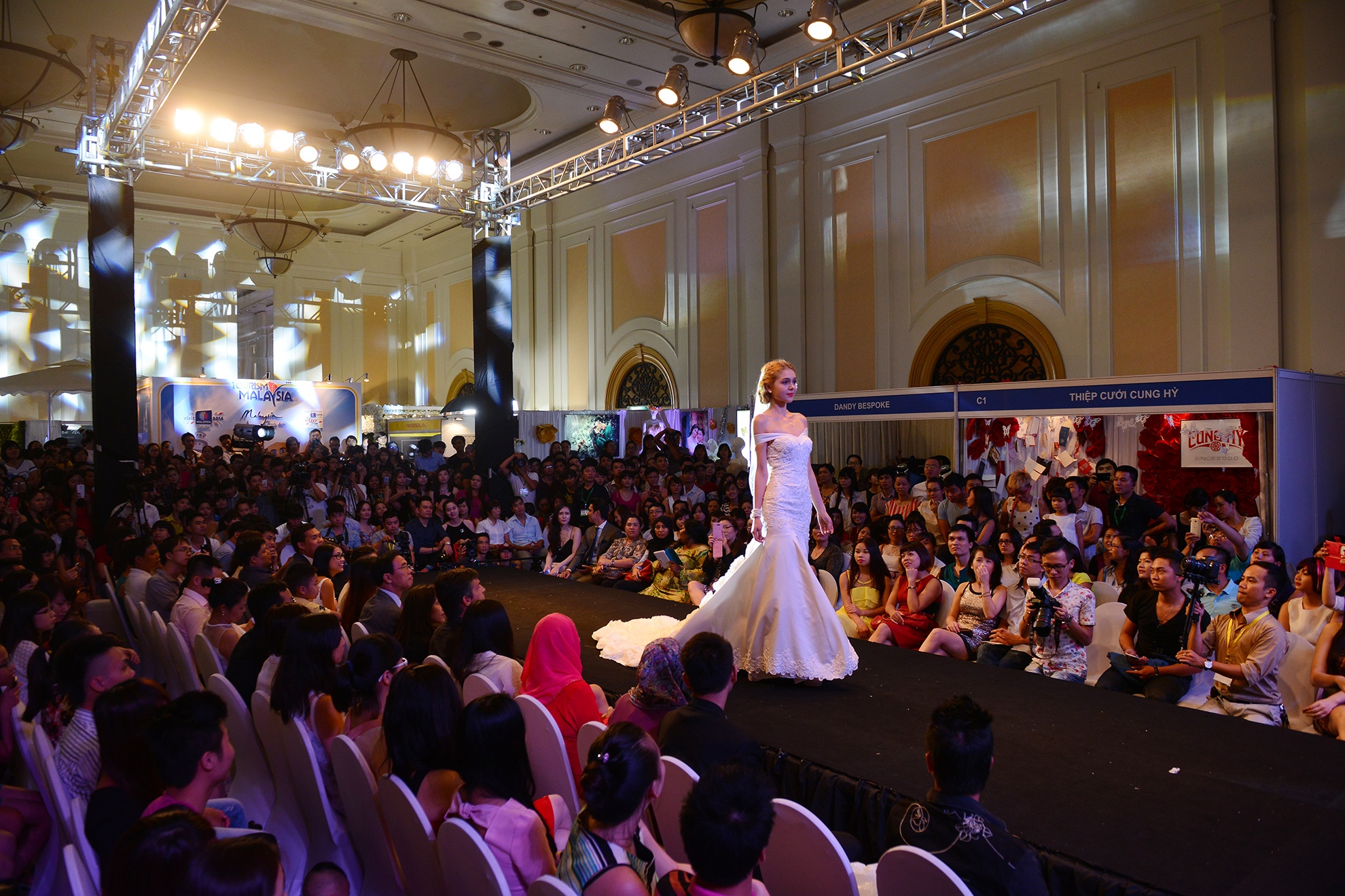 | Buổi trình diễn thời trang cưới trong khuôn khổ chương trình Triển lãm cưới và du lịch trăng mật 2014 được tổ chức tại khách sạn Daewoo (Hà Nội) tối 16/8 đã thu hút hàng trăm bạn trẻ đón xem, chật kín hội trường lớn. |