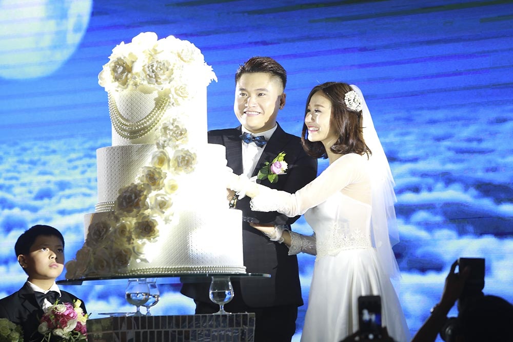 Cô dâu chú rể cùng cắt bánh cưới. Họ quen nhau trong một lần đi ăn cùng nghệ sĩ Trường Giang. DJ Tiên Moon đang mang bầu đứa con đầu lòng.