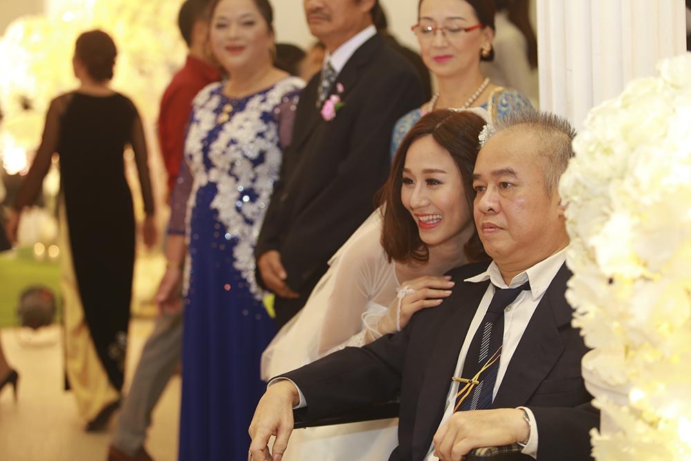 | Tiên Moon bên cạnh bố chồng - NSƯT Vũ Đình Hải. Bị bệnh nặng và phải ngồi xe lăn nhưng ông vẫn cố gắng góp mặt trong ngày vui của con. |