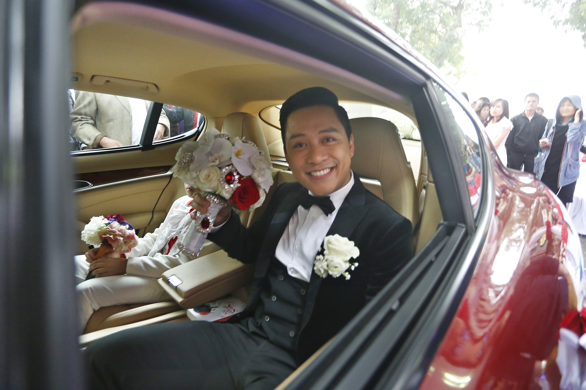 | Tuấn Hưng bảnh bao trên xe hoa. Anh được một phù rể nhí tháp tùng khi đi đón dâu. |