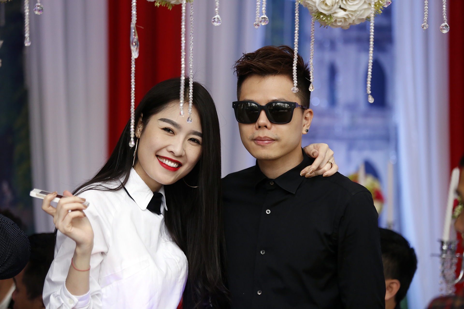 | Quế Vân và Trịnh Thăng Bình - hai nghệ sĩ đàn em của Tuấn Hưng - cũng tháp tùng anh sang nhà gái đón dâu. |