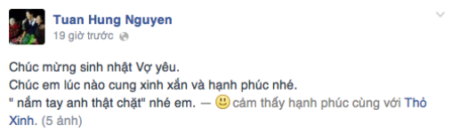 Về phía mình, Tuấn Hưng cũng không quên chúc mừng vợ yêu trên trang cá nhân và đăng tải những hình ảnh hạnh phúc của cặp đôi.
