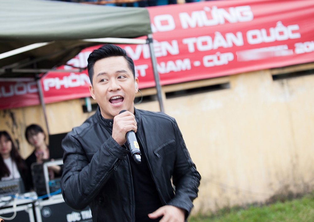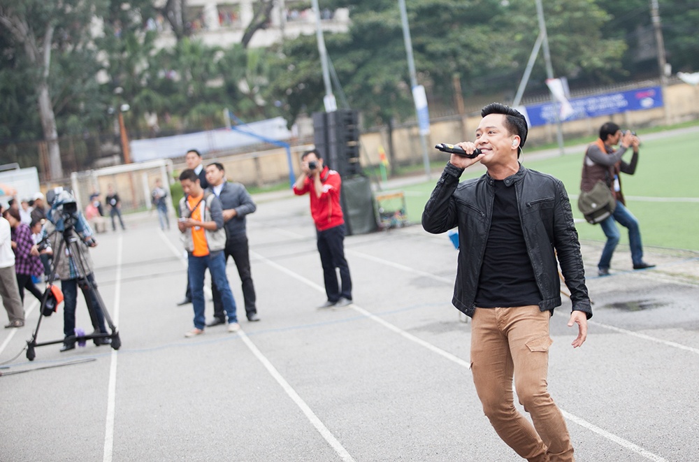 Nam ca sĩ "Nắm lấy tay anh" biểu diễn ca nhạc trong trận chung kết giải Cúp bóng đá sinh viên toàn quốc diễn ra chiều 16/11 tại Hà Nội.