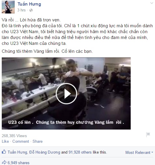 Tuấn Hưng cho biết hành động của anh cũng chỉ vì tình yêu với bóng đá. Chàng ca sĩ chia sẻ niềm tin rằng có rất nhiều người như anh, sẵn sàng làm mọi điều để tạo thêm động lực chiến đấu cho các cầu thủ.
