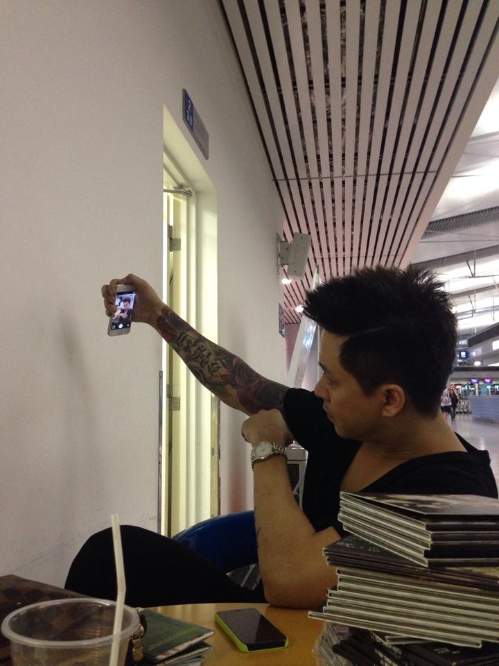 | Một người bạn cũng tham gia chuyến đi quanh châu Âu này đã chụp lại khoảnh khắc Tuấn Hưng "tự sướng" ở sân bay và chia sẻ trên trang cá nhân của anh. |
