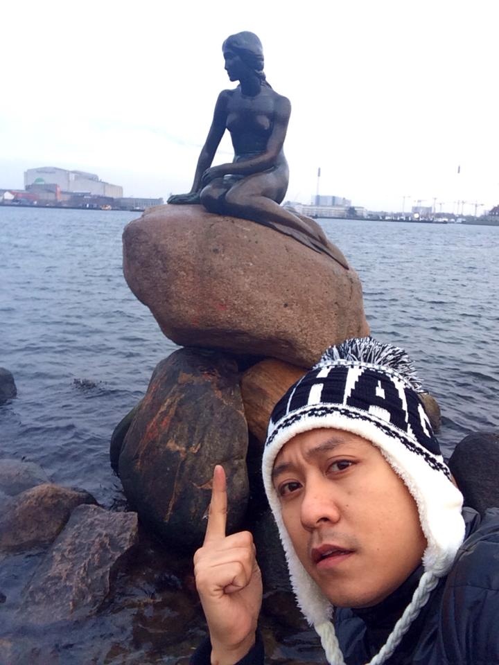 | Tuấn Hưng tạo dáng bên bức tượng nàng tiên cá nổi tiếng ở Thủ đô Đan Mạch. |