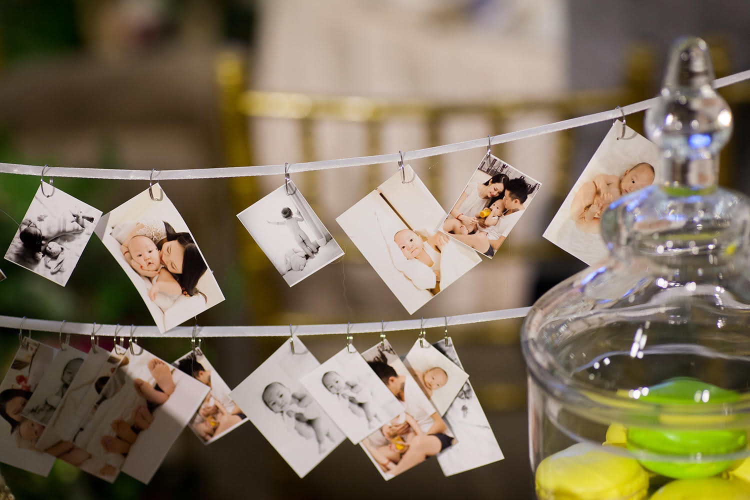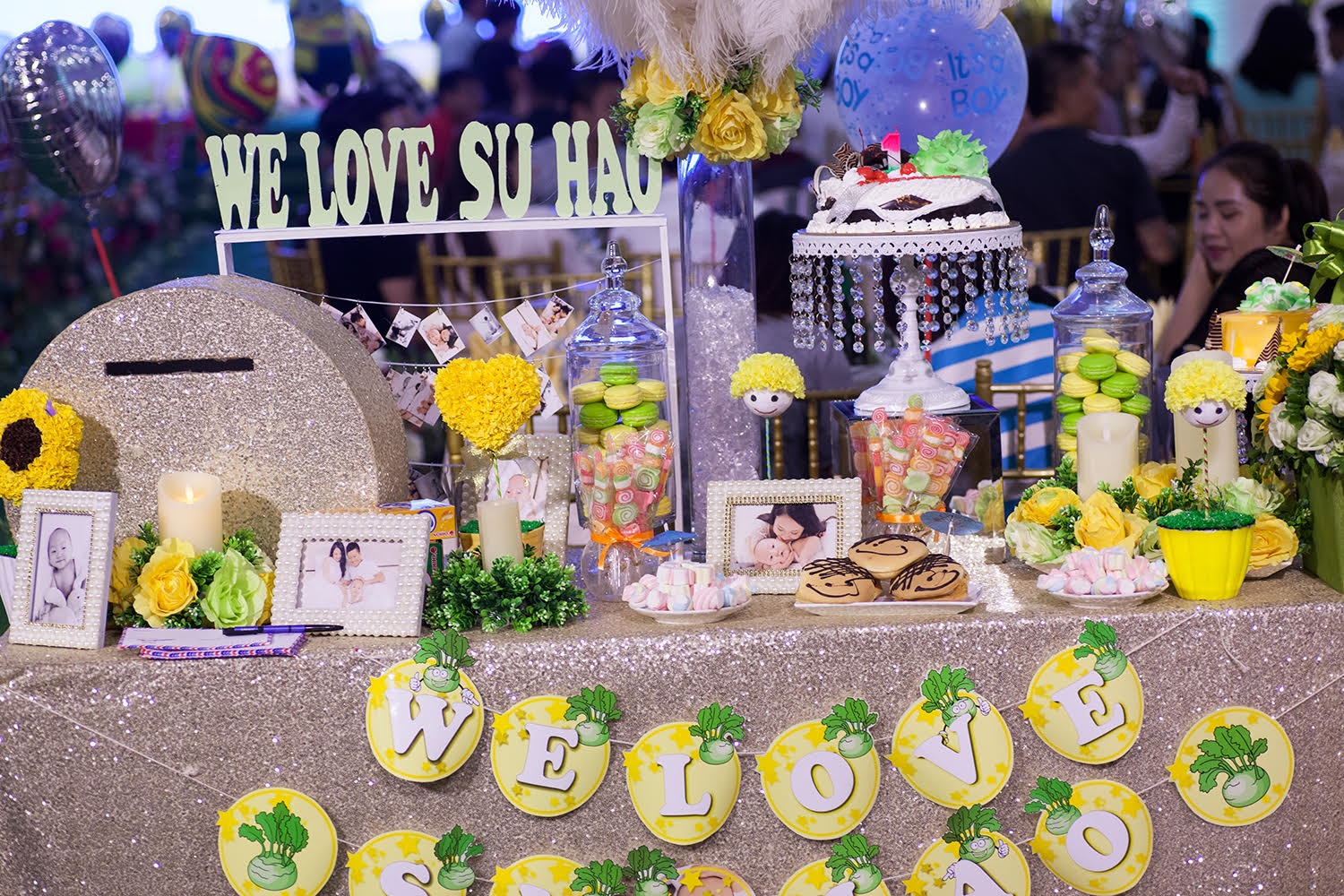 Tuấn Hưng trang trí sảnh đón khách bằng những củ su hào ngộ nghĩnh với dòng chữ "We love Su Hao". Những hình ảnh đáng yêu của 3 thành viên trong gia đình cũng được bày tại đây. |