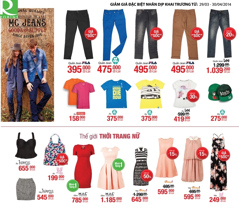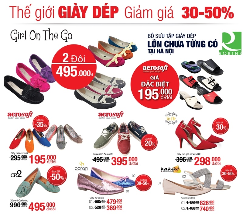 Nhiều chương trình giảm giá khác lên đến 50% đang đợi bạn tại Thế giới giày dép, Thế giới mỹ phẩm, Thế giới thời trang nam nữ… đang sở hữu các thương hiệu nổi tiếng trên thế giới, Thái Lan và Việt Nam. Vào ngày 29/3 này, đến Trung tâm mua sắm Robins (tầng B1, Royal City, Hà Nội) để khám phá và mua sắm.