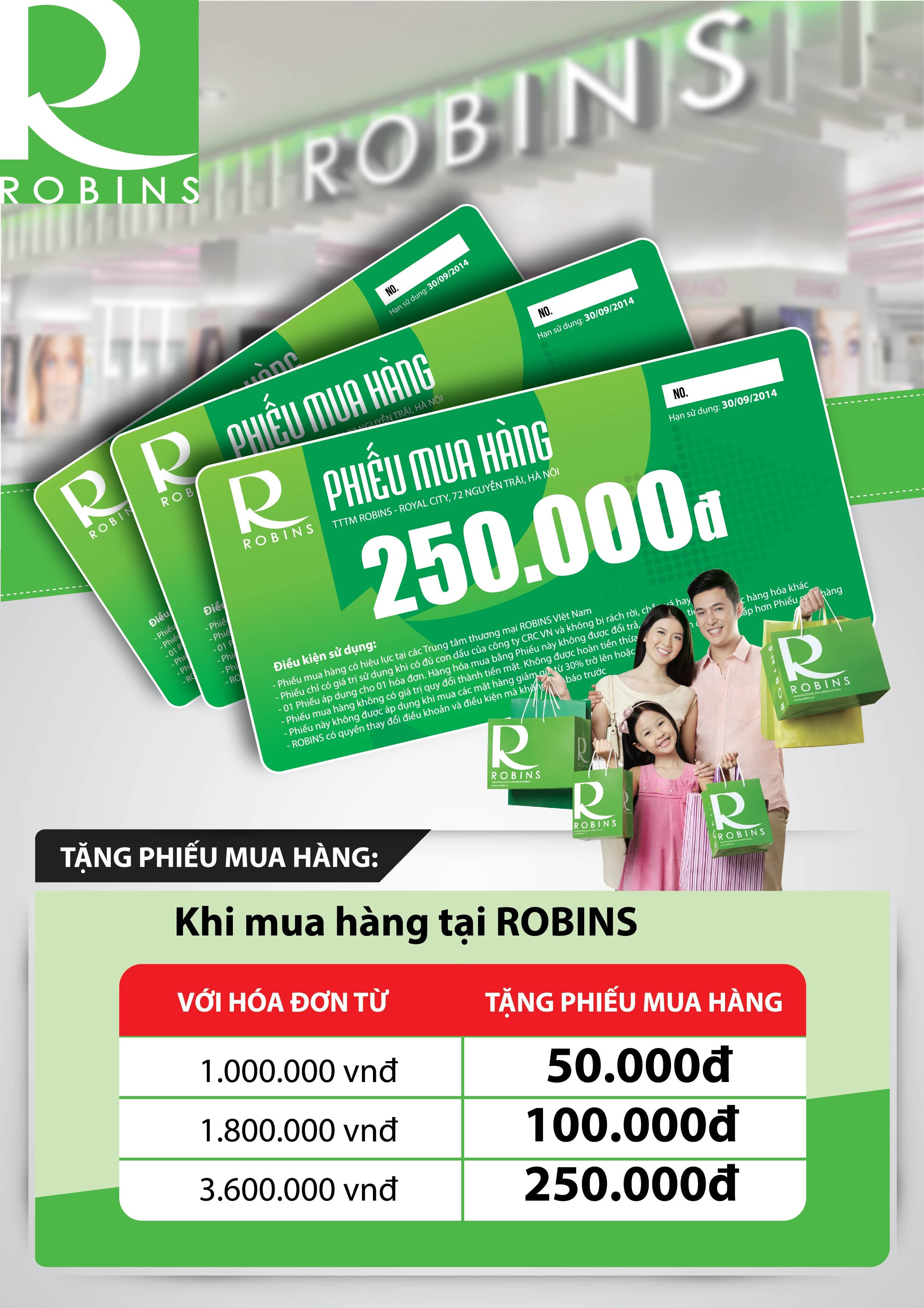 Tận hưởng mua sắm tại trung tâm mua sắm Robins, bạn sẽ được tặng thêm phiếu mua hàng hấp dẫn có thể đổi lấy giảm giá cho lần mua sắm sau: