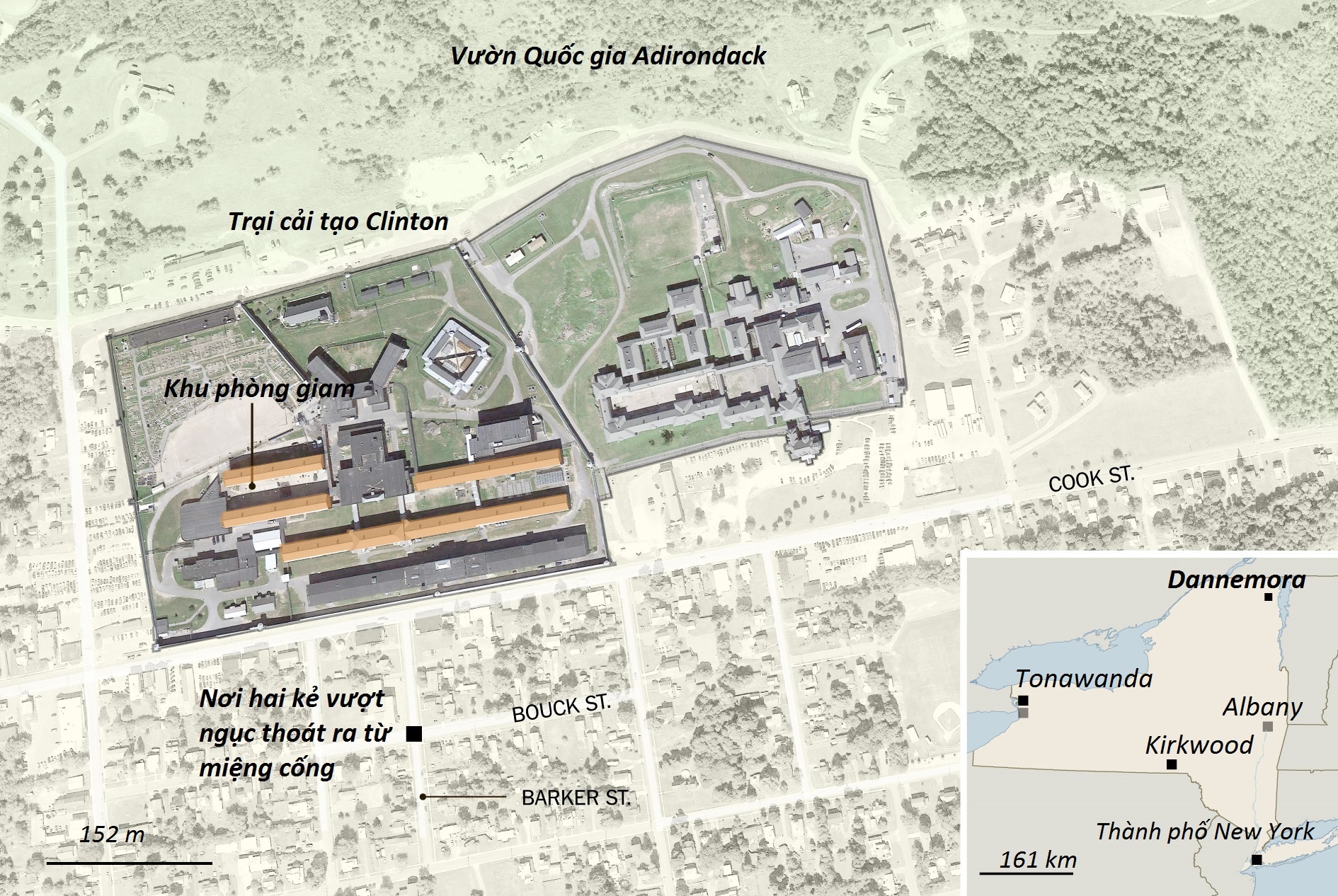 | Bản đồ mô phỏng vị trí nhà tù Clinto và nơi hai tên sát nhân vượt ngục trốn thoát. Đồ họa: New York Times |