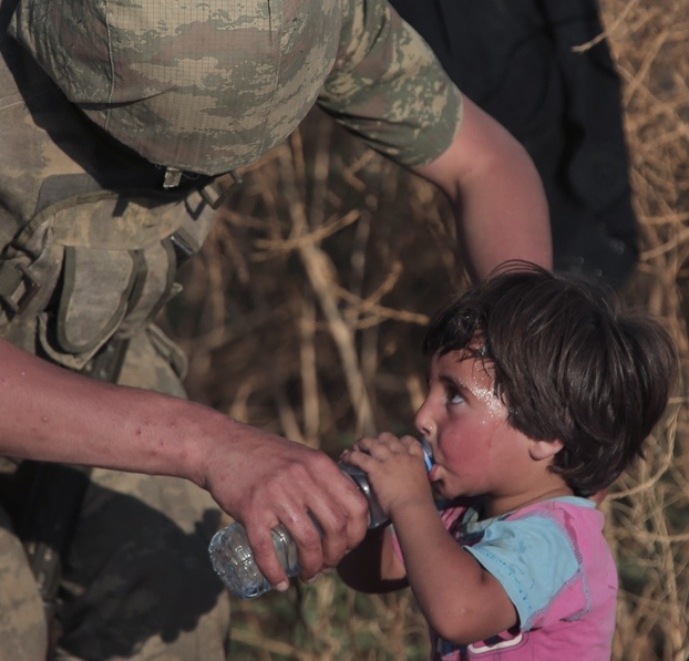 | Một người lính Thổ Nhĩ Kỳ chia sẻ nước uống với một trẻ Syria đang trên đường tị nạn. Ảnh: AP |