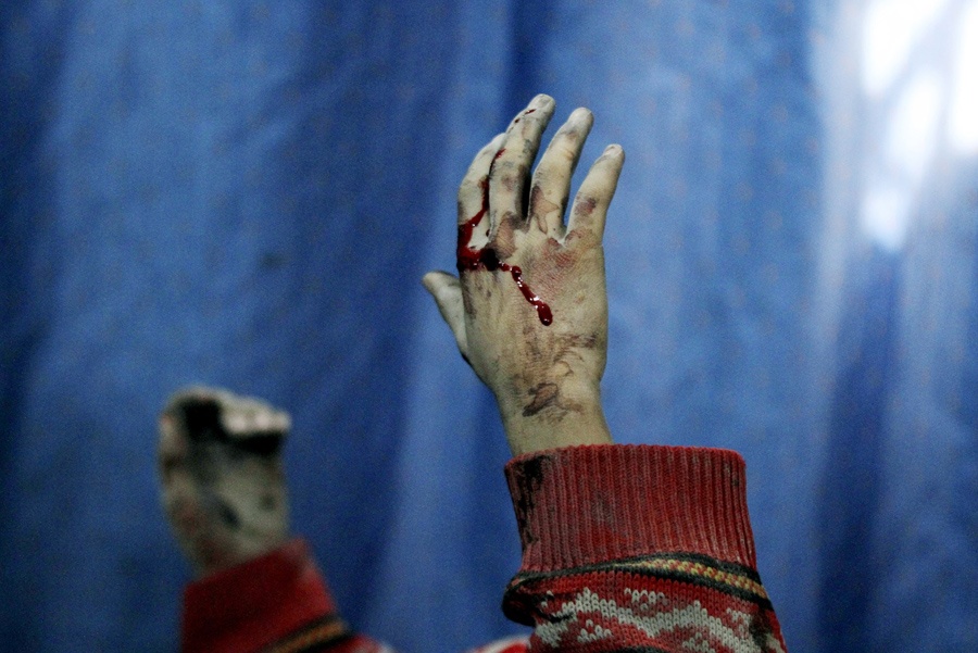 | Bàn tay chảy máu của một bé trai nằm tại bệnh viện ở thị trấn Douma, ngoại ô thủ đô Damascus, sau khi chính phủ Syria tiến hành một vụ không kích nhằm vào nơi này hôm 6/2. Ảnh: Reuters |