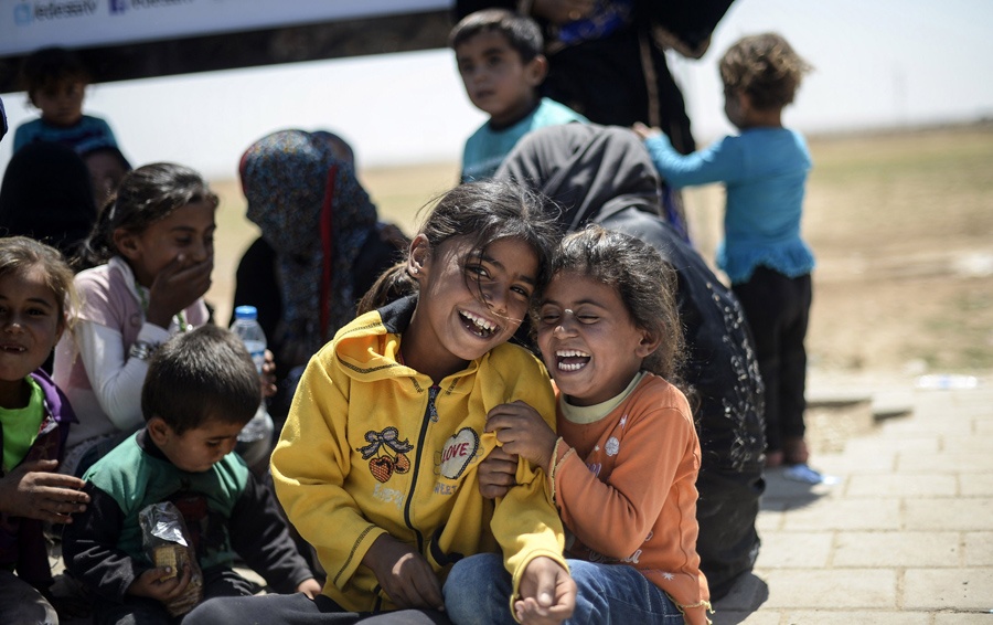 | Hai bé gái tị nạn người Syria vui đùa khi ngồi chờ ở cổng biên giới Syria - Thổ Nhĩ Kỳ ngày 18/6. Ảnh: AFP |
