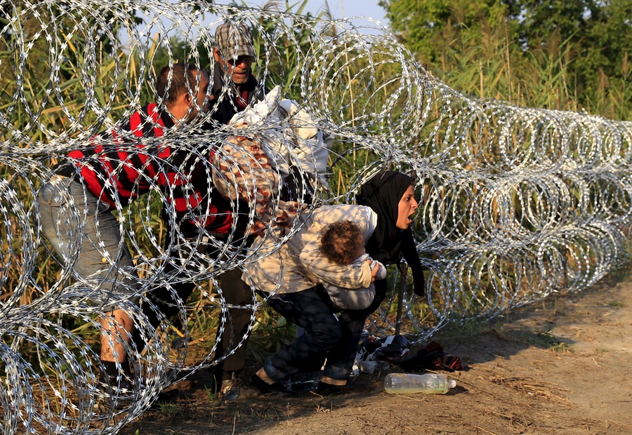 | Một gia đình Syria vợt qua hàng rào để vào biên giới Hungary từ Serbia ngày 27/8. Chính quyền Hungary mới đây đã tăng cường lực lượng an ninh ở biên giới để đối phó với dòng người nhập cư tăng cao kỷ lục, phần lớn là người Syria. Ảnh: Reuters |