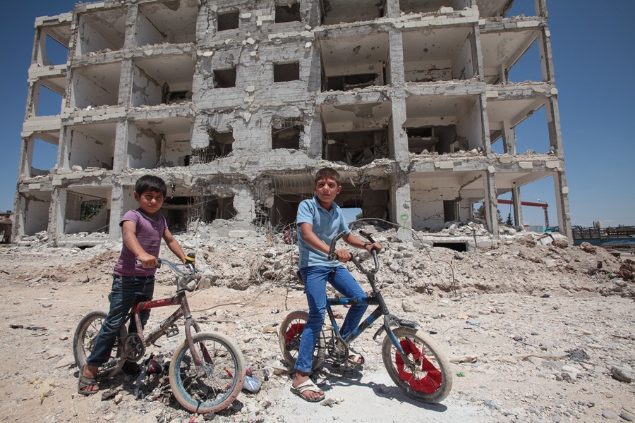| Trẻ em Syria đạp xe trước một tòa nhà ở trung tâm thị trấn Kobane ngày 20/6. Lực lượng người Kurd đã giành quyền kiểm soát Kobane sau khi đẩy lùi phiến quân Nhà nước Hồi giáo (IS). Ảnh: AFP |