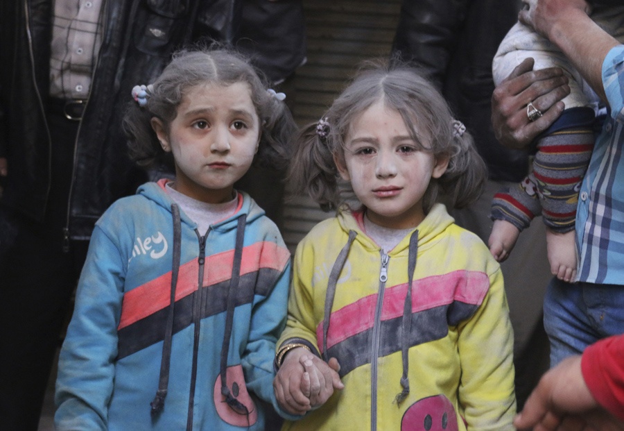 | Những bé gái sống sót nắm tay nhau sau khi quân đội Syria tấn công quân nổi dậy tại thị trấn Allepo ngày 7/4 bằng tên lửa. Ảnh: Reuters |