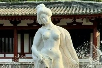Những bức ảnh lan truyền trên mạng cho thấy bức tượng khắc họa một phụ nữ thời xưa (được xác định là Dương Quý Phi nổi tiếng thời Đường) trong trạng thái gần như khỏa thân, có lớp khăn choàng che bộ phận riêng tư nhất, nhưng lộ thân trên.