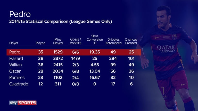 Nếu tính trung bình số bàn thắng hoặc đường kiến tạo trên số phút, Pedro vượt xa so với các đồng đội mới ở Chelsea. Tuyển thủ người Tây Ban Nha mất 127,4 phút để ghi bàn hoặc kiến tạo. Trong khi Oscar – cầu thủ chạy cánh hiệu quả nhất ở Chelsea mất 145,3 phút. Eden Hazard mất 146,6 phút. Những vị trí tiếp theo thuộc về Ramires (183,7 phút) và Willian (483 phút).