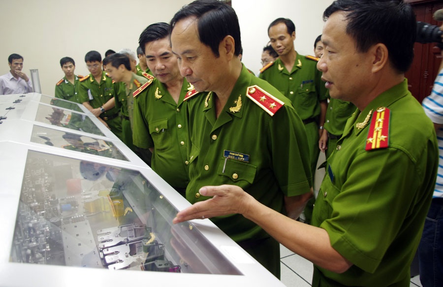 Thứ trưởng Bộ Công an Phạm Quý Ngọ kiểm tra dây chuyền sản xuất chứng minh thư (ghi tên cha mẹ) bằng công nghệ mới hồi tháng 9/2012