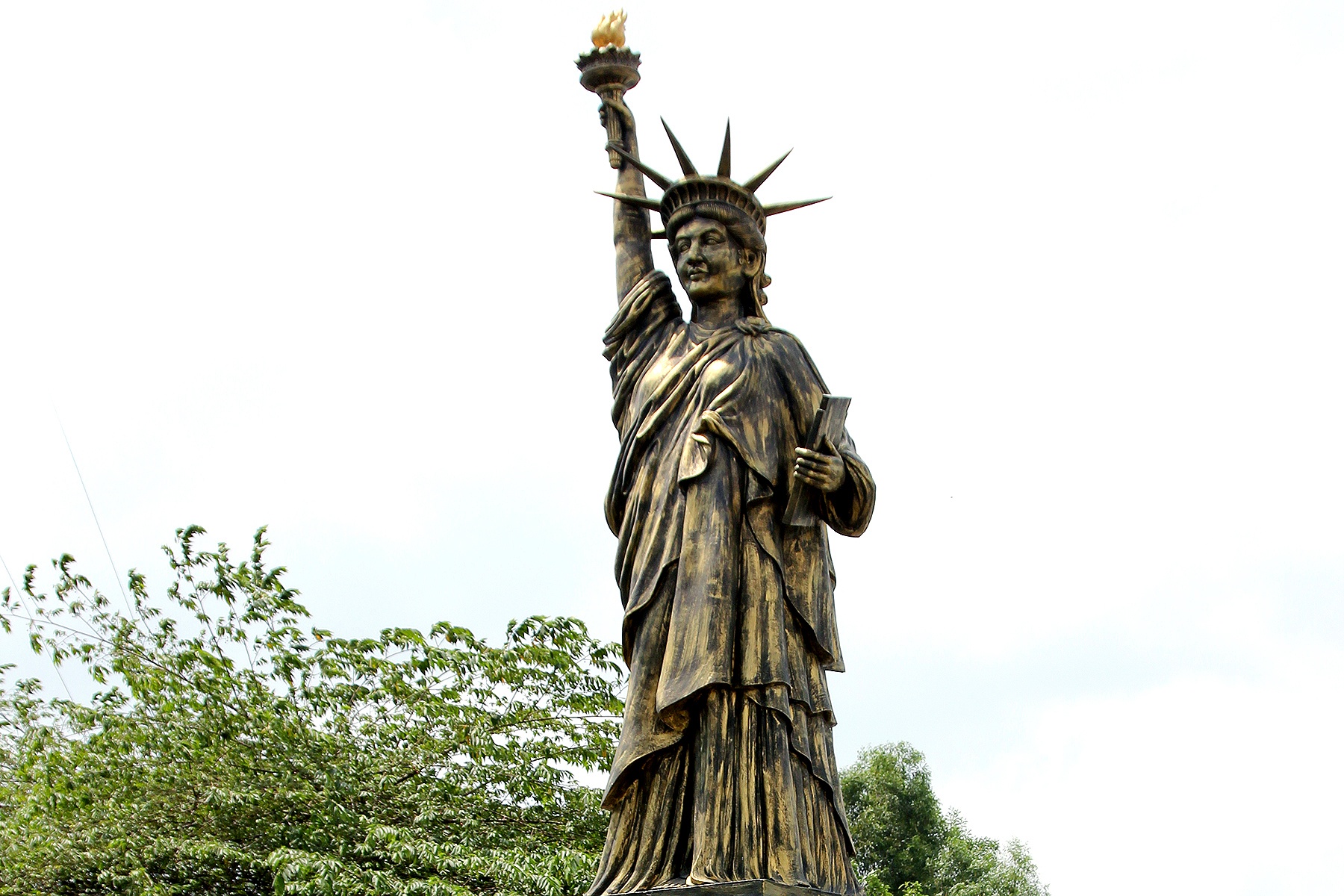 | Bức mô phỏng tượng nữ thần tự do giống ở Mỹ, cao hơn 12 m được một chủ xưởng chuyên làm tượng bày bán với giá 10.000 USD ven quốc lộ 22, đường đi Củ Chi (TP.HCM). |
