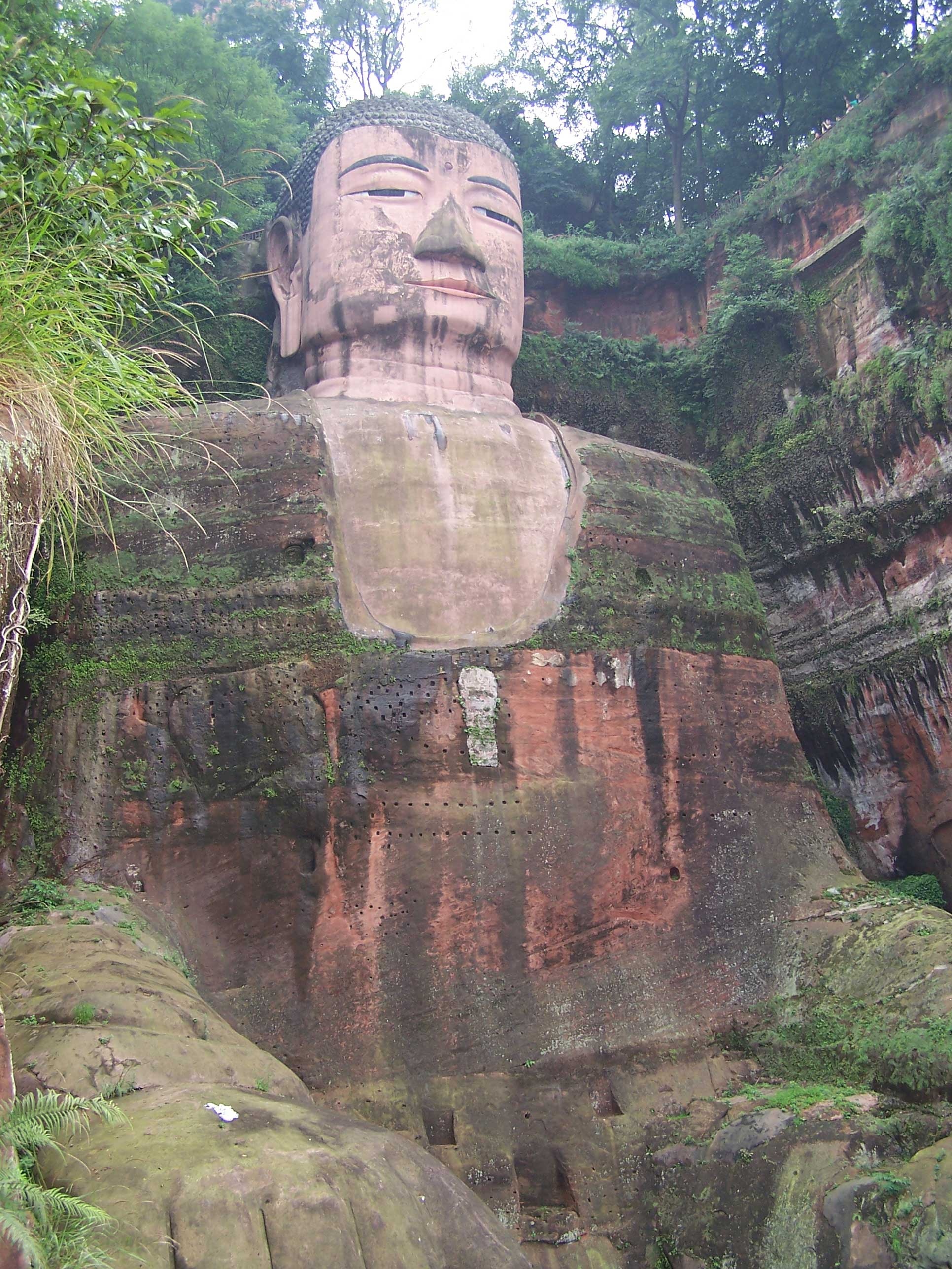Bức tượng mô tả Phật đang ngồi đặt tay trên gối. Người ta tạc bức tượng năm 713 trên vách đá Thê Loan, núi Lăng Vân, dãy Nga Mi thuộc tỉnh Tứ Xuyên, Trung Quốc. Ảnh: Wikipedia. |