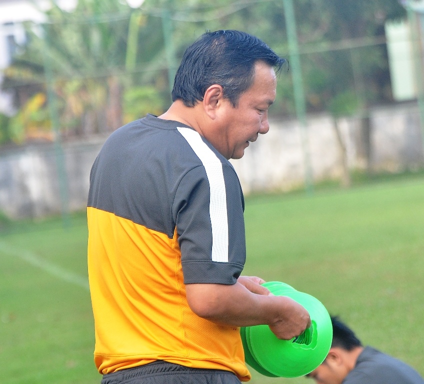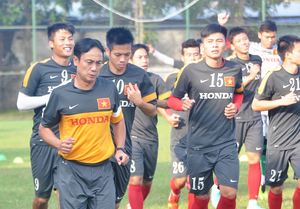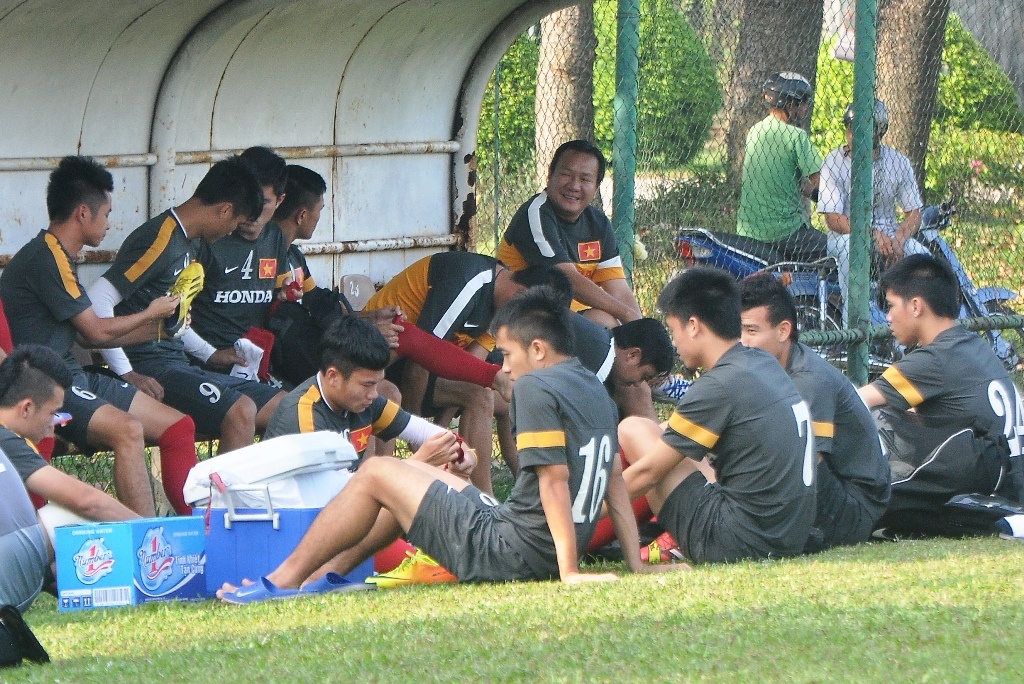 | HLV Hoàng Văn Phúc gượng cười khi cùng các cầu thủ chuẩn bị vào tập. |