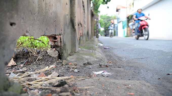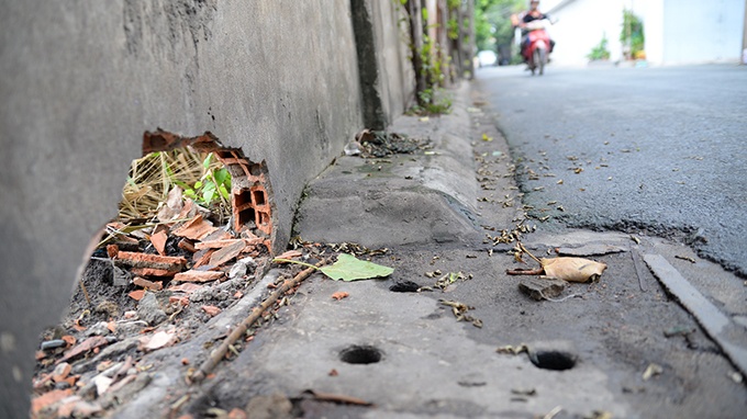 | Theo ghi nhận tại hành lang an toàn hàng rào sân bay Tân Sơn Nhất (TP.HCM), một đoạn tường dài khoảng 500m nhưng có đến 12 lỗ thủng bị người dân đục khoét. |
