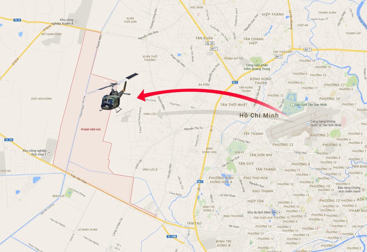 | Mô tả vị trí xuất phát và rơi của trực thăng UH-1. Đồ họa: Nguyên Anh. |