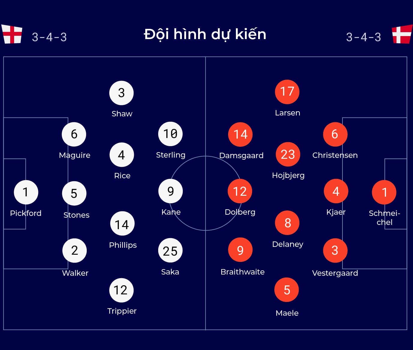 “Tam sư” đã quen với cách bố trí này khi đối đầu với Đức trước đó. Vì thế các cầu thủ sẽ không cảm thấy lạ lẫm. Trên hàng công, tuyển Anh sẽ vẫn trông chờ vào khả năng quấy rối hàng thủ của Sterling và Sancho hoặc Bukayo Saka bên cánh. Và tất nhiên khi Kane khai nòng, hàng thủ Đan Mạch cần phải dè chừng.