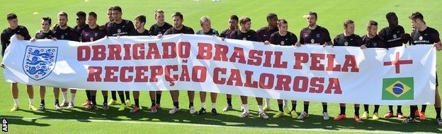 Trở lại buổi tập tại Urca, các cầu thủ Anh đã giăng một biểu ngữ lớn mang dòng chữ “Obrigado Brasil pela recepcao calorosa”, tạm dịch là “Cảm ơn Brazil đón tiếp nồng hậu”. Sau đó thầy trò HLV Roy Hodgson được thưởng thức bài hát We Are The Champions và âm nhạc truyền thống từ một ban nhạc địa phương.