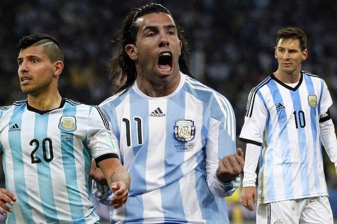 | Đội tuyển Argentina không có sự phục vụ của 3 tiền đạo chủ lực Aguero, Tevez và Messi (từ trái qua phải). Ảnh: Soccertv. |