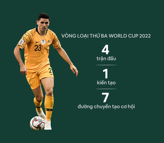 Bên cạnh đó, cánh phải của Australia cũng rất mạnh. Họ có 5 bàn xuất phát từ các pha triển khai tấn công ở hành lang này. Rhyan Grant là hậu vệ giỏi tấn công với một bàn và 3 kiến tạo ở vòng loại World Cup. Anh chính là người đã ghi bàn vào lưới tuyển Việt Nam với pha xâm nhập vùng cấm và đánh đầu. Việc tiền vệ Jackson Irvine cũng luôn sẵn sàng lùi sâu để hỗ trợ phòng ngự cũng tạo điều kiện để Grant thoải mái tấn công.