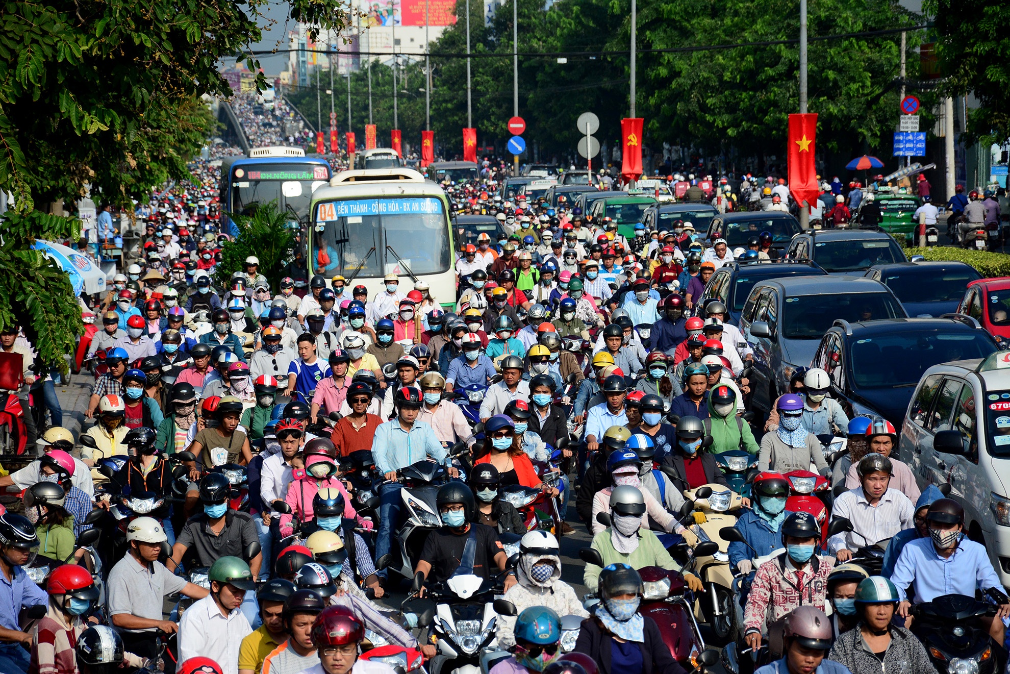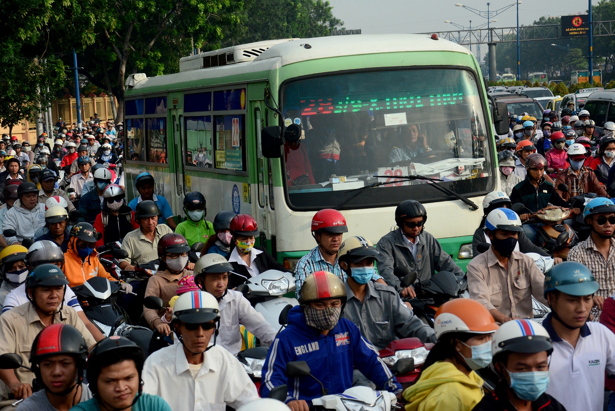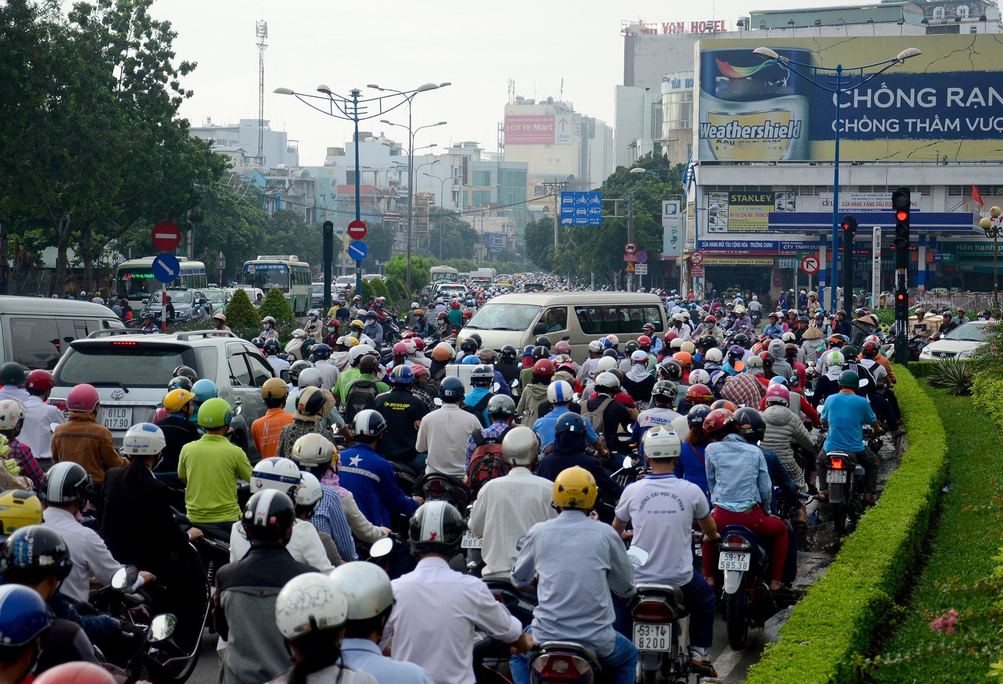 | Từ 6h sáng, dòng người và xe cộ từ ngã tư An Sương, cùng các đường nhánh như Phan Văn Hớn, Nguyễn Văn Quá, Phan Huy Ích... thuộc các quận, huyện như Củ Chi, Hóc Môn, Gò Vấp, Tân Bình... ùn ùn vào tuyến đường độc đạo Trường Chinh từ cửa ngõ tây nam để đi vào trung tâm TP và ngược lại. Đoạn đường rộng với 3 làn ôtô và 1 làn xe máy quá tải kéo dài đến gần 9h sáng. |