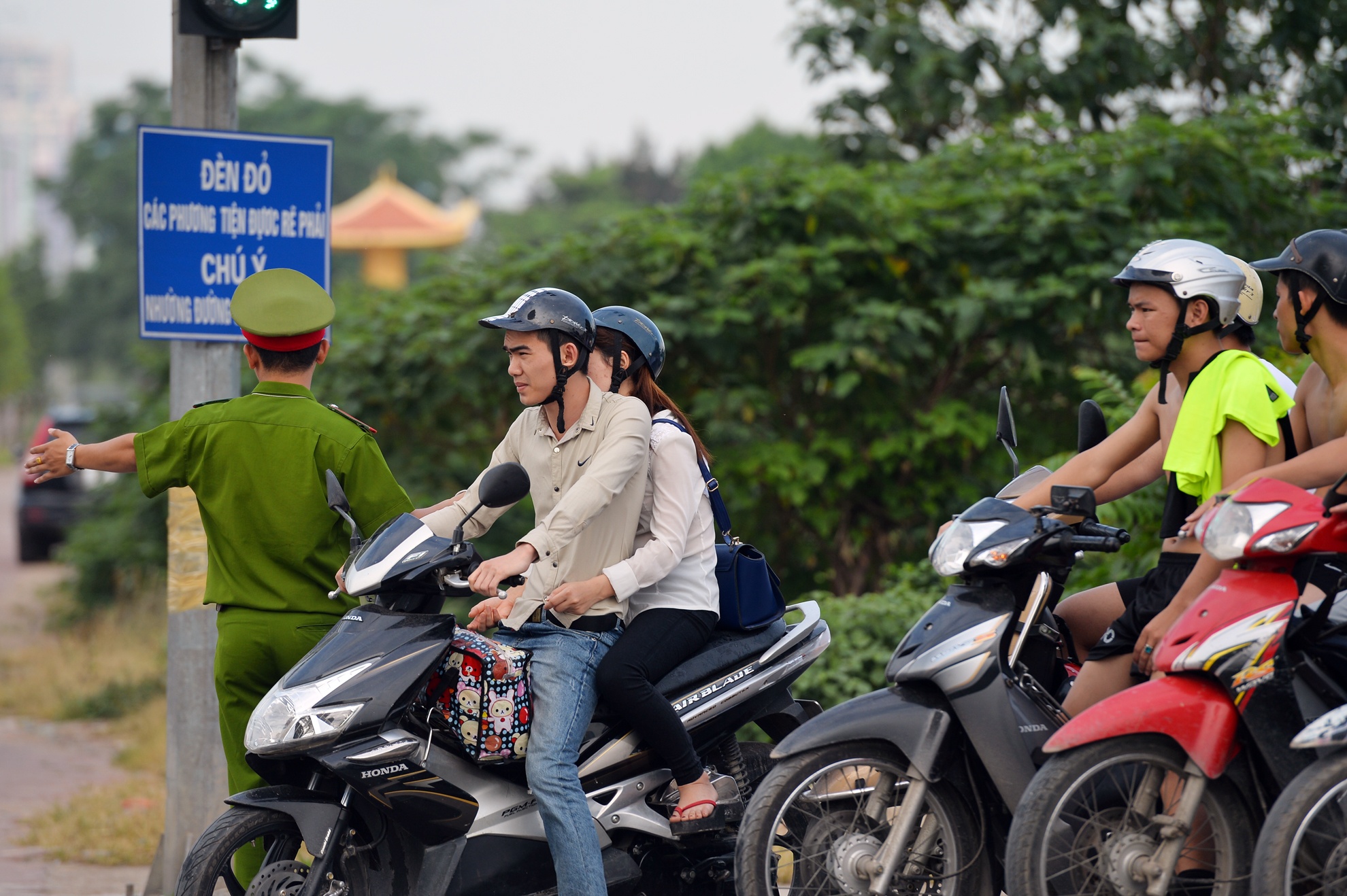 Cảnh sát cố gắng phân luồng, tạo điều kiện cho các phương tiện được đi nhanh, nhưng ngay cả lối cho xe rẽ phải cũng bị người đi thẳng lấn chiếm.