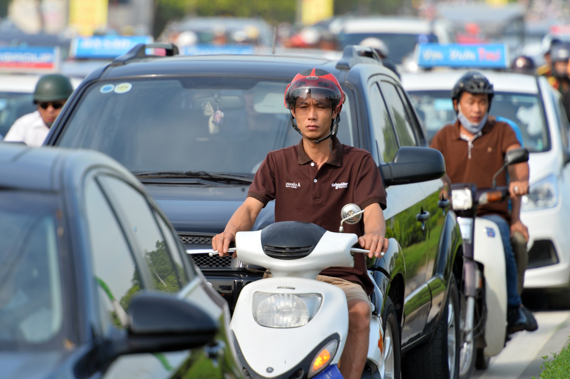 | Nhiều người đi xe máy lấn làn ôtô, tạt ngang, bất cứ chỗ nào trống là đưa xe vào. |