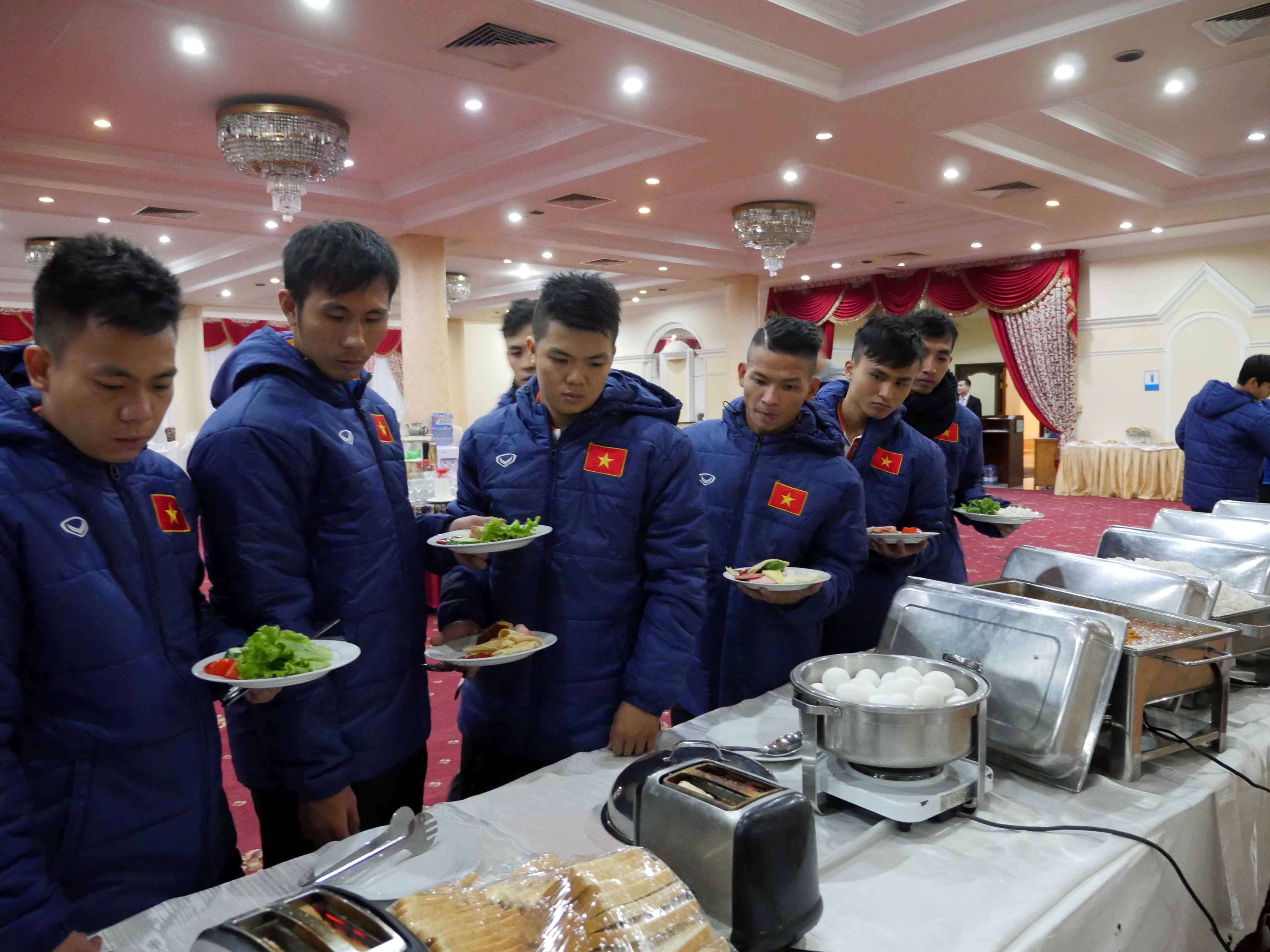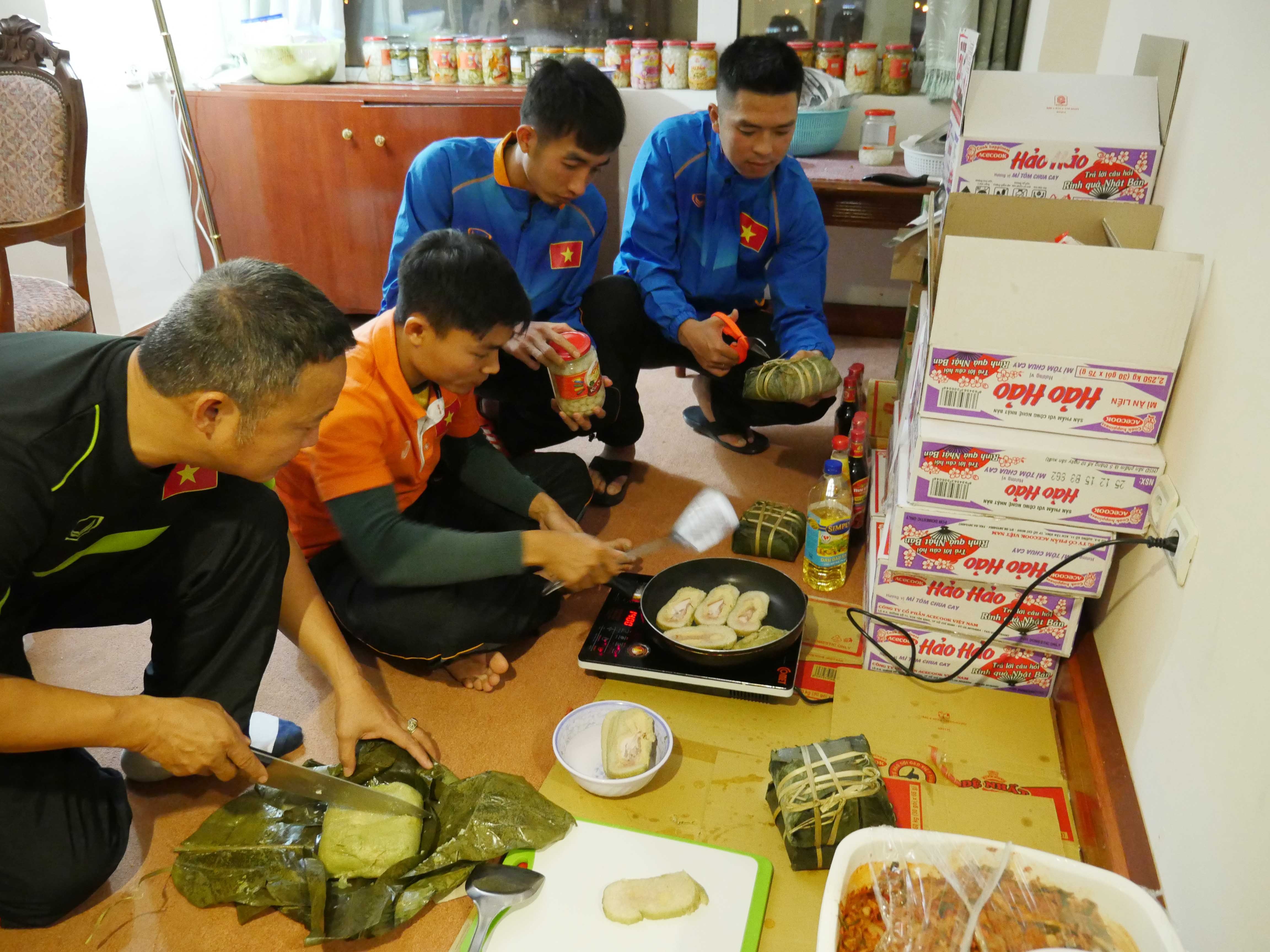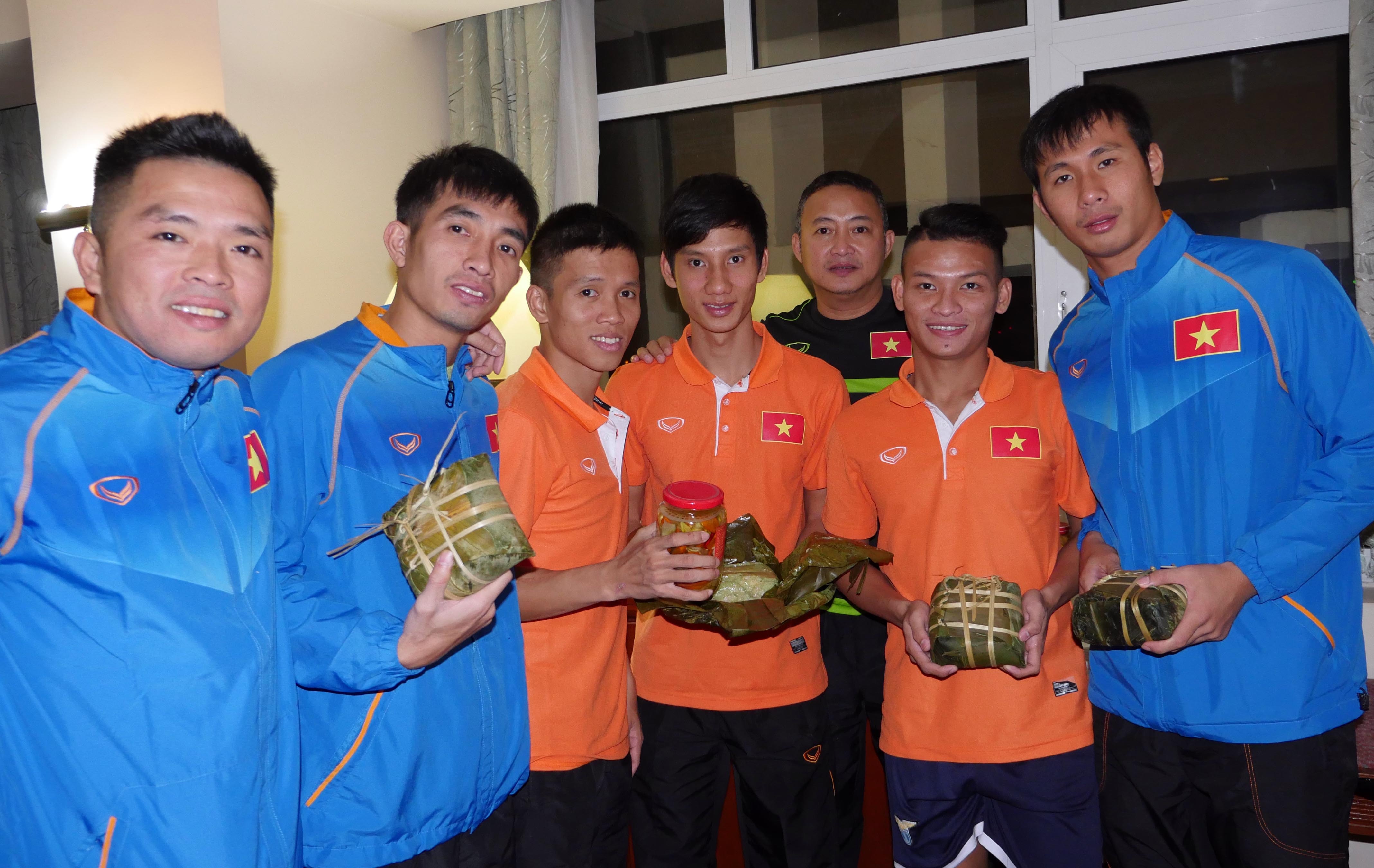 | Ngoài bánh chưng, đội còn mang sang Uzbekistan nhiều mì tôm, dưa món, lạp xưởng, nước mắm, xì dầu... để khi cần là chia nhau ăn. Trong thời tiết lạnh giá tại Uzbekistan, "bánh chưng rán" trở thành món khoái khẩu của toàn đội. Ngày 3/2, trưởng đoàn Trần Anh Tú mới bay sang hội quân cùng đội. Trong hành lý ký gửi, ông mang theo thêm món ăn khác cho các cầu thủ bởi thời gian đội tập luyện, thi đấu tại Uzbekistan còn kéo dài đến ít nhất sau ngày 15/2. |